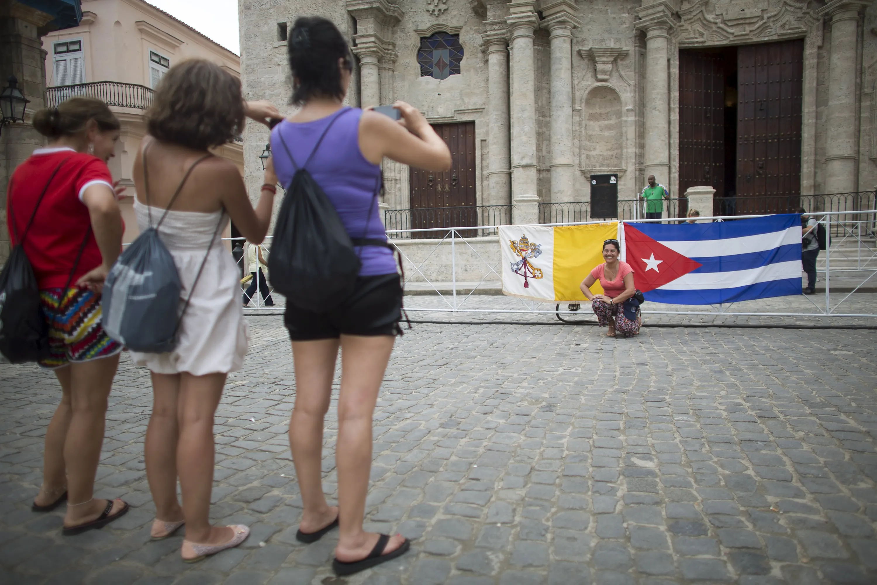 People take pictures with the Vatican (L) and Cuban flags in front of the The Cathedral of The Virgin Mary of the Immaculate Conception in Havana, September 18, 2015. (Photo by Alexandre Meneghini/Reuters)