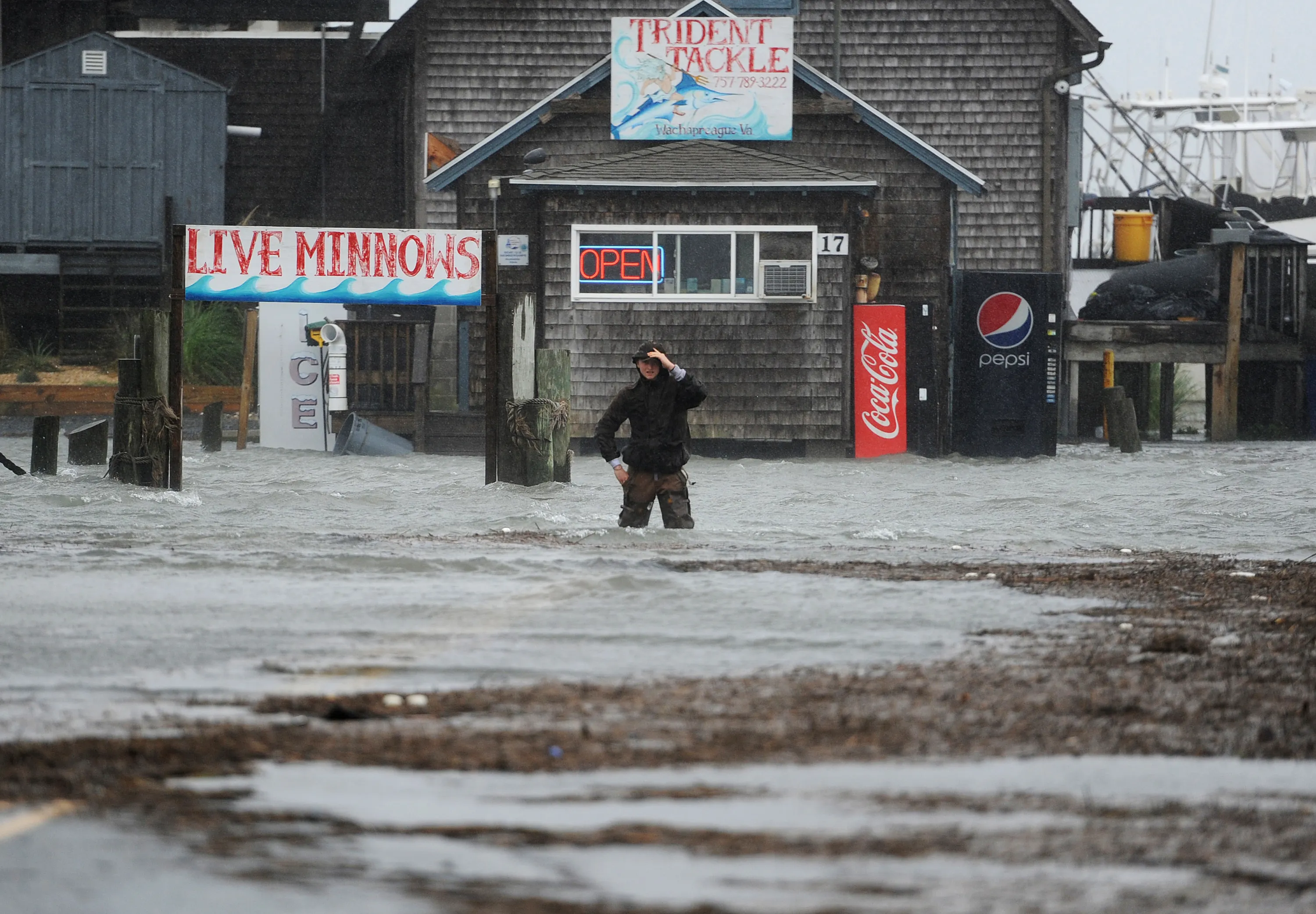 Quinn Hurt looks across Atlantic Avenue as he attempts to cross the flooded street in Wachapreague, Va., Friday, October 2, 2015. A storm system brought heavy rain and wind into the region as well as major coastal flooding. (Photo by Jay Diem/The Daily Times via AP Photo)