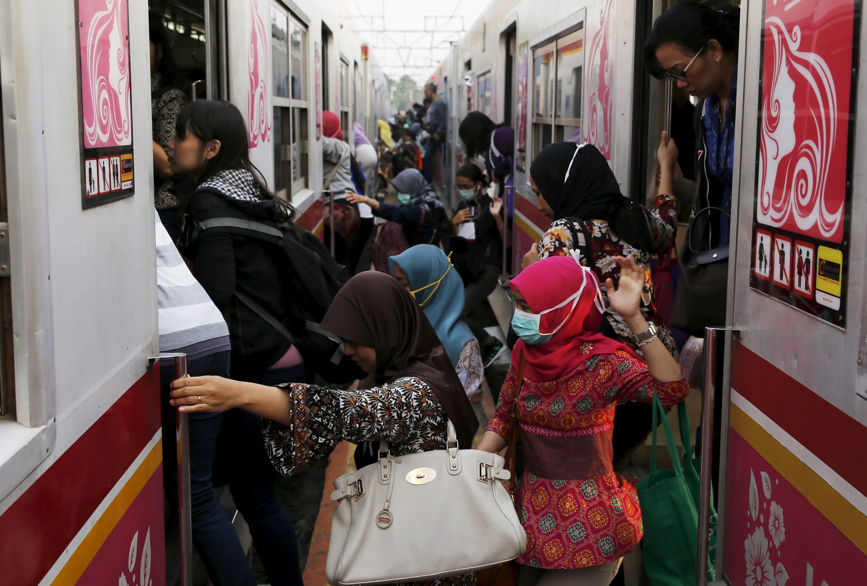 Women board commuter trains at Duri station in Jakarta, October 2, 2015. (Photo by Reuters/Beawiharta)