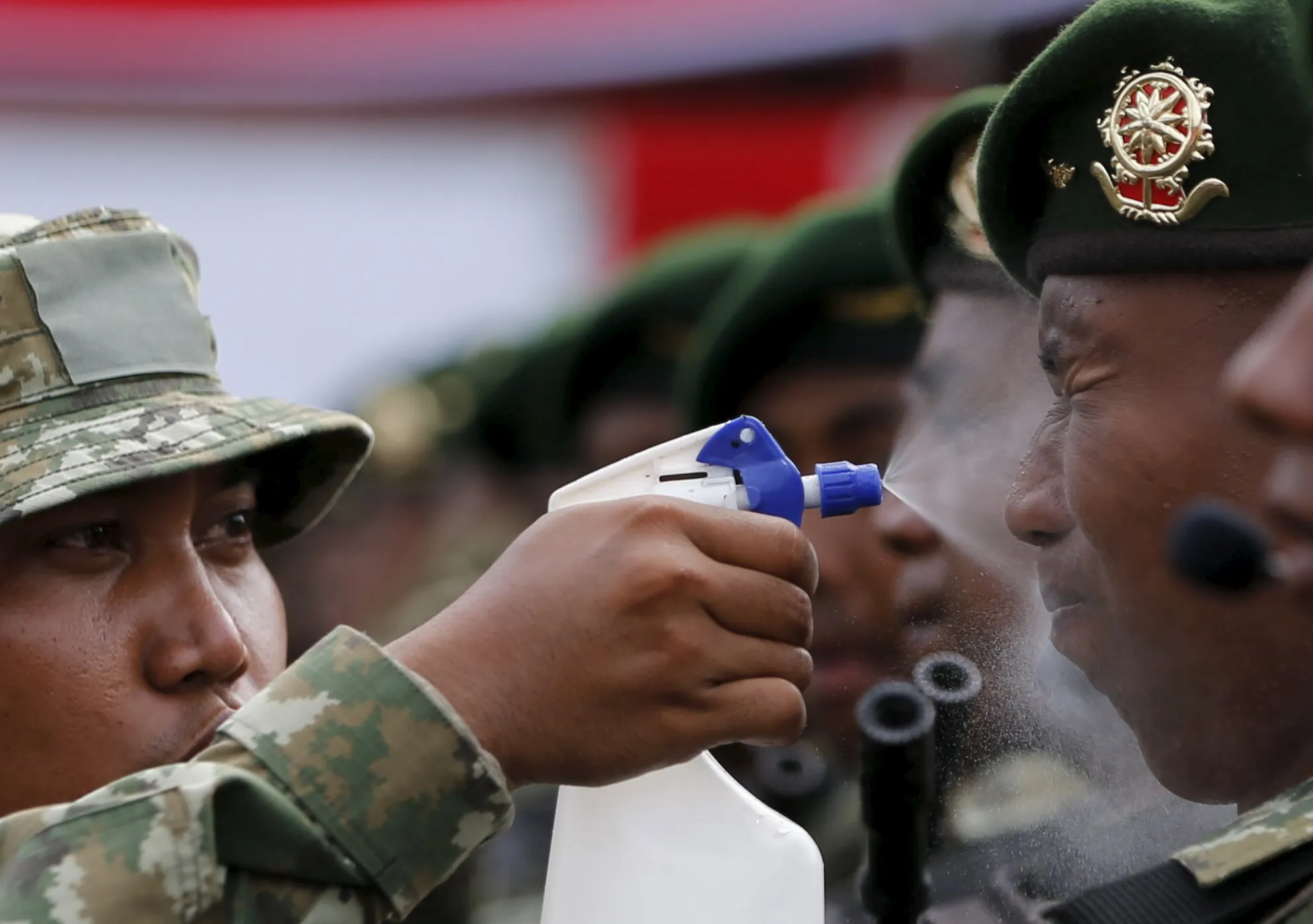 An Indonesian soldier sprays water onto the face of his colleague face before a rehearsal for a ceremony marking the 70th anniversary of Indonesia's military in Cilegon, Banten province, October 3, 2015. (Photo by Reuters/Beawiharta)