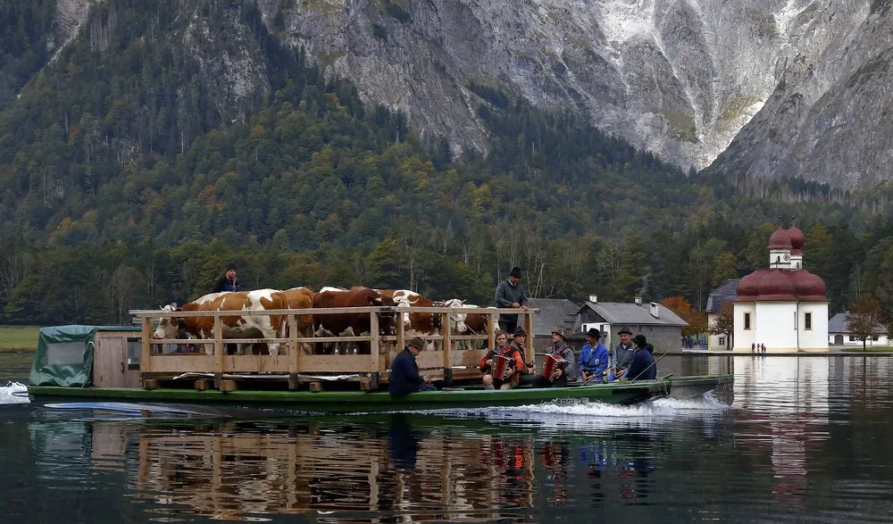 Bavarian farmers transport their cows on a boat over the picturesque Lake Koenigssee October 3, 2015, as they pass the lake's landmark, the chapel of St. Bartholomae that dates back to the 12th century. Before the winter season approaches the farmers have to drive their cattle down from their Alpine meadows to a narrow valley that can only be reached by boat. (Photo by Michael Dalder/Reuters)