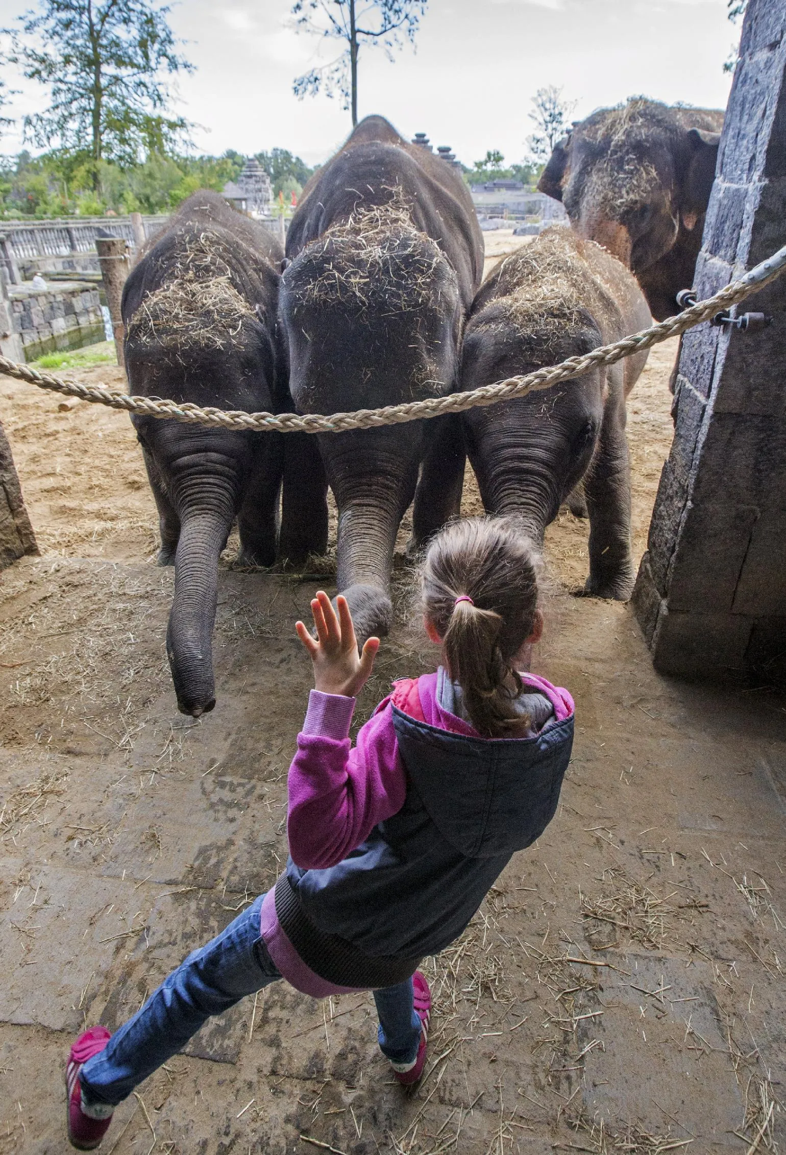 Belgian girl Lola, 6, gestures in front of elephants at the Pairi Daiza wildlife park in Brugelette, September 6, 2015. Lola has been living in Pairi Daiza since she was born. Her father Koen Vanderschueren, who currently works as the zoo's deputy-manager, arrived in the park when it opened 19 years ago. Her mother Tania works as a zookeeper specialising in pandas and the nursery. (Photo by Yves Herman/Reuters)