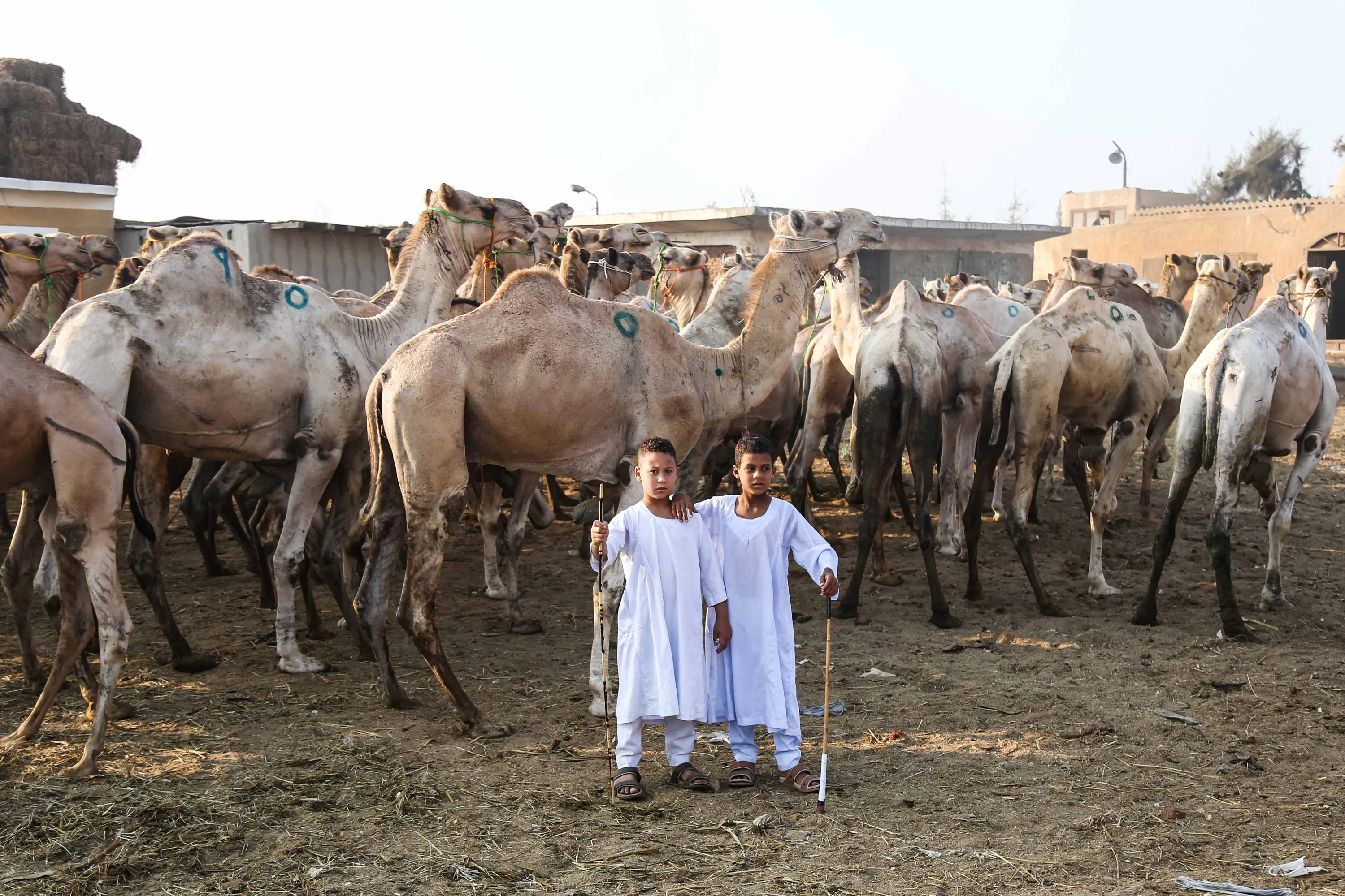 Two boys pose for a portrait during an auction at Birqash Camel Market just outside of Cairo, Egypt, Friday, September 18, 2015 ahead of next week's Eid al-Adha holiday. Muslims all over the world celebrate the three-day festival Eid al-Adha, by sacrificing sheep, goats, camels and cows to commemorate the willingness of the Prophet Ibrahim (Abraham to Christians and Jews) to sacrifice his son, Ismail, on God's command. (Photo by Mohammed El Raai/AP Photo)