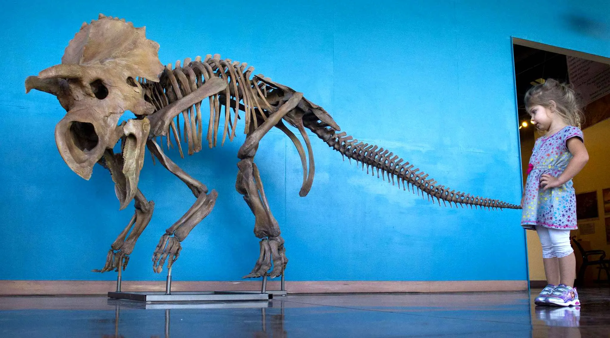 Brynley Lorentz, 3, of Colorado Springs, Colo., looks at a dinosaur Wednesday, September 16, 2015, at the Rocky Mountain Dinosaur Resource Center in Woodland Park, Colo. (Photo by Mark Reis/The Gazette via AP Photo)