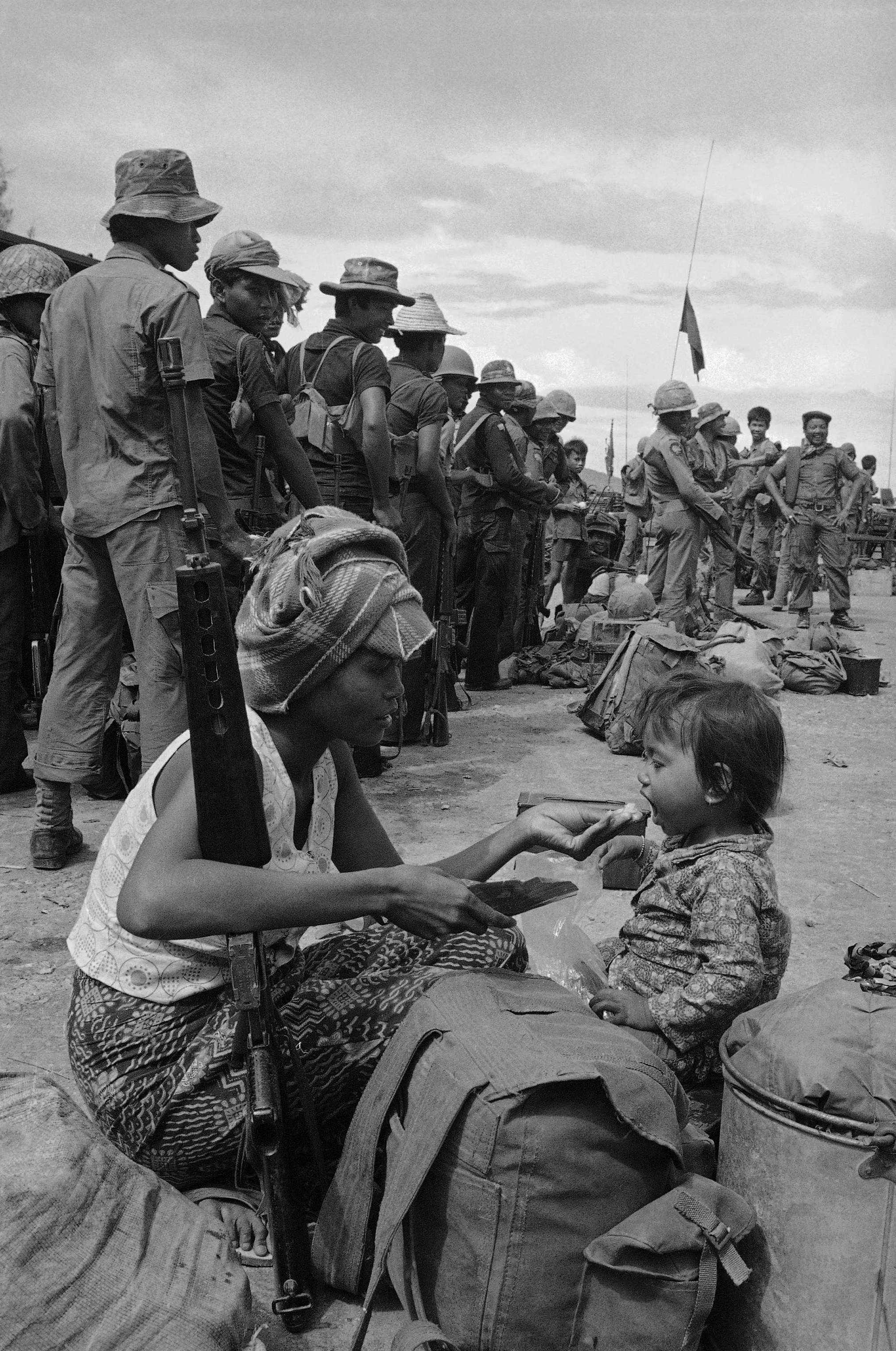 The wife of a Cambodian government soldier feeds her daughter a ball of rice as they come to say goodbye as his unit heads out on an operation to retake positions lost to Khmer Rouge insurgents near the province capital of Kampong Chhnang north of Phnom Penh, October 1, 1974. In Cambodia, families often live with the soldiers, especially in static positions such as base camps and outposts, but do not accompany them on actual operations. (Photo by Tea Kim Heang aka Moonface/AP Photo)