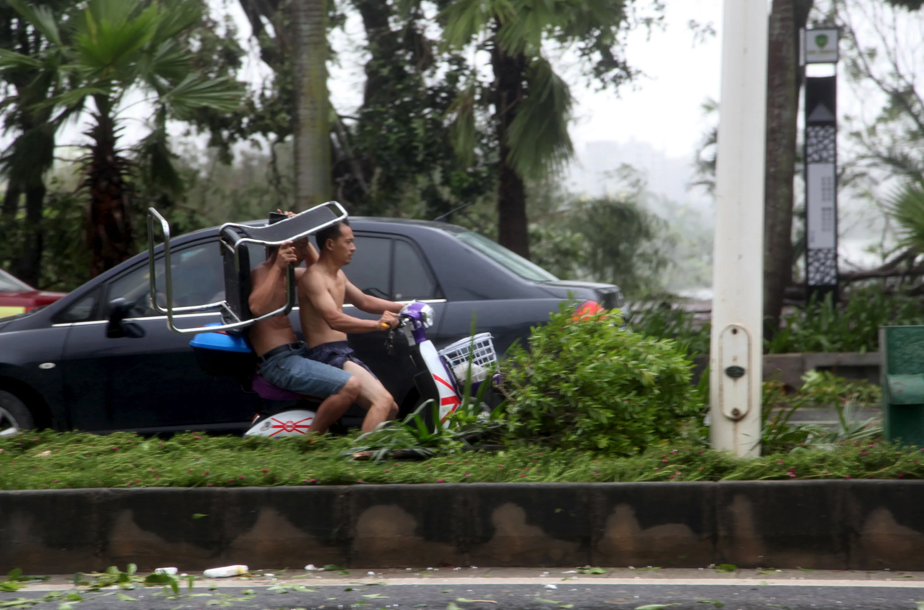 Men ride an electric bike along a street as Typhoon Mujigae hits Zhanjiang, Guangdong province, October 4, 2015. A typhoon with winds up to 112 miles an hour lashed China's south coast on Sunday, killing at least four people and leaving a trail of destruction and flooding as authorities issued the highest "red alert" emergency response. (Photo by Reuters/Stringer)