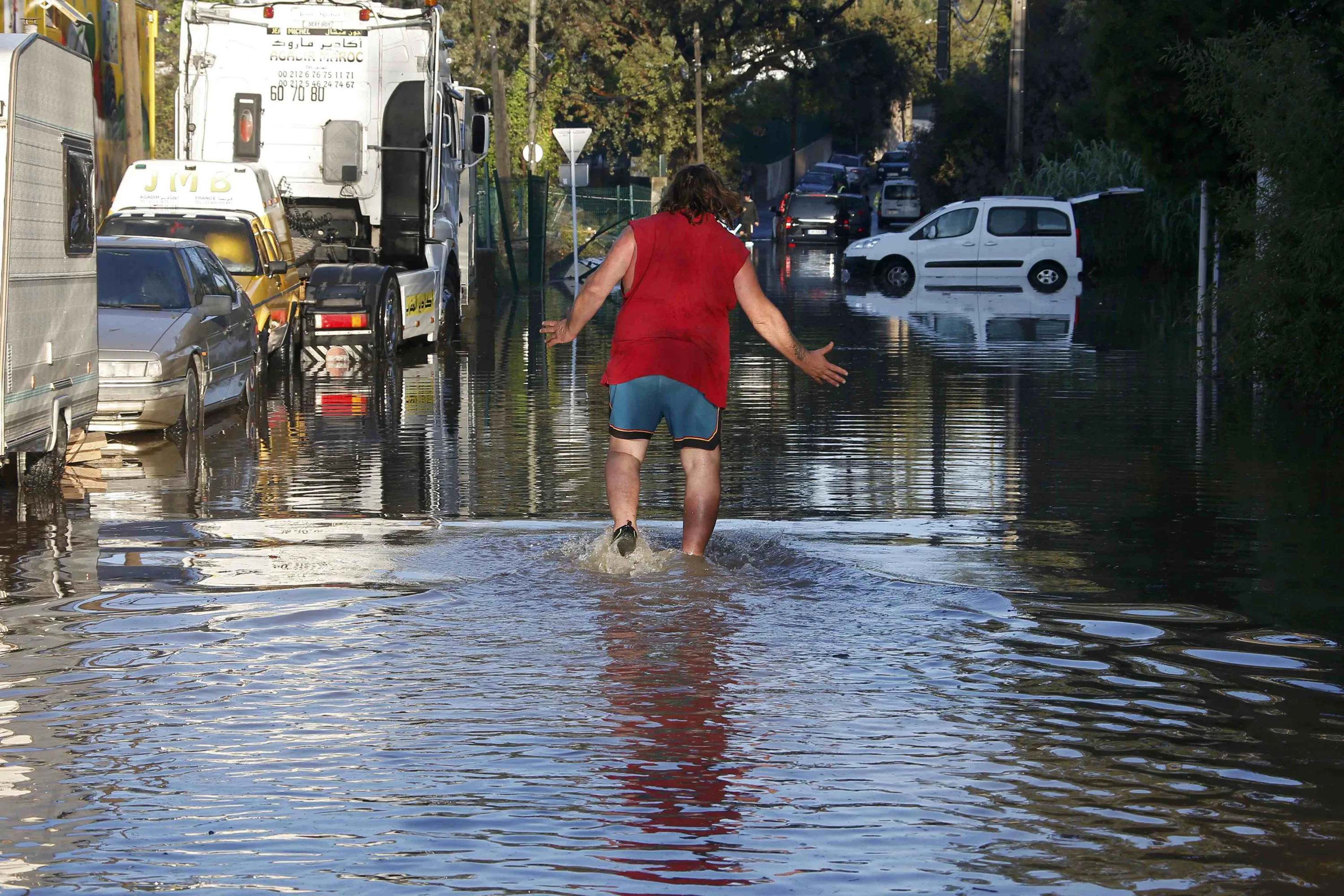 A man reacts as he wades through flood waters near cars after flooding caused by torrential rain in Biot, France, October 4, 2015. (Photo by Eric Gaillard/Reuters)