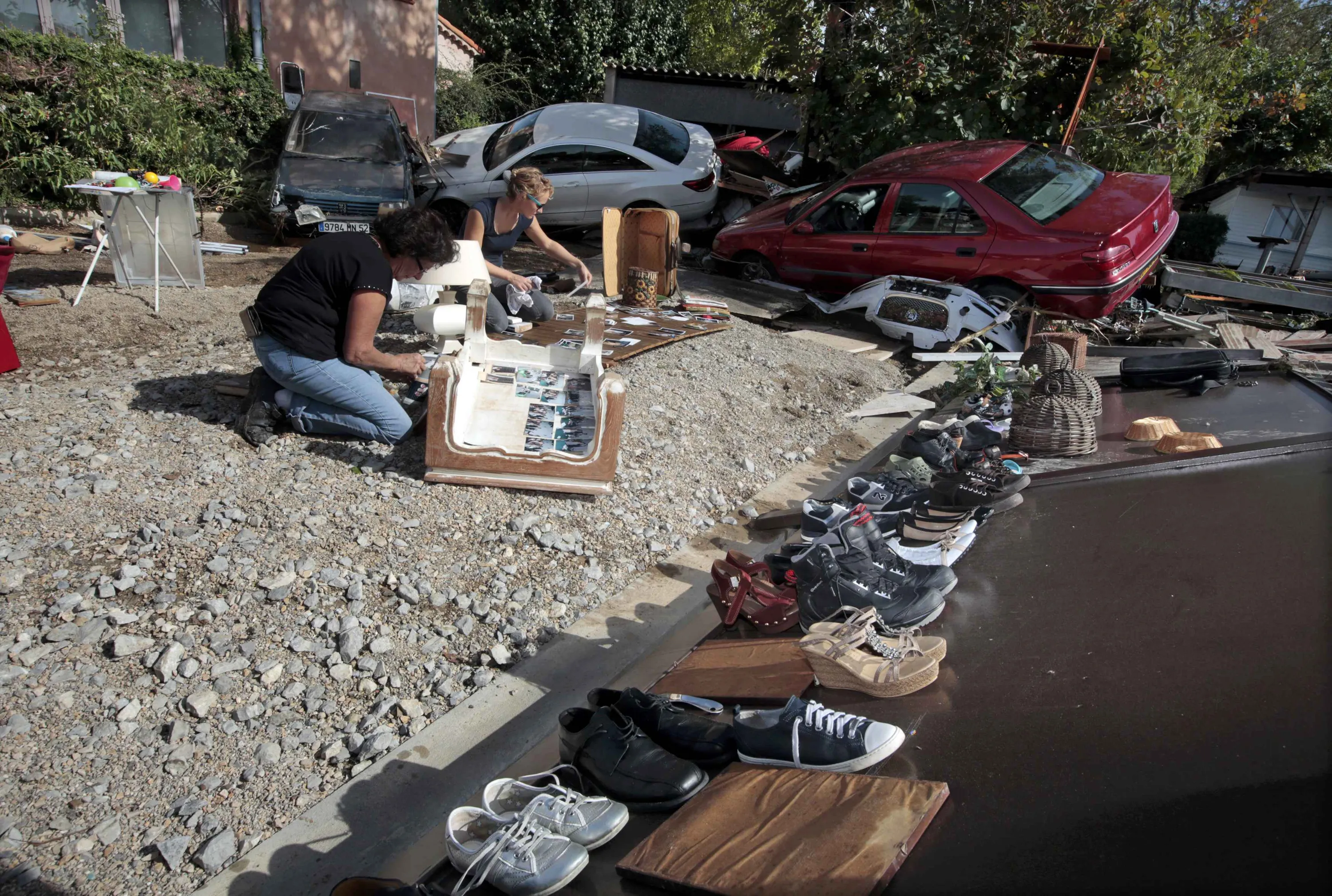 Women place family pictures out to dry, saved from their home, near cars that were damaged after flooding caused by torrential rain in Biot, France, October 4, 2015. (Photo by Eric Gaillard/Reuters)