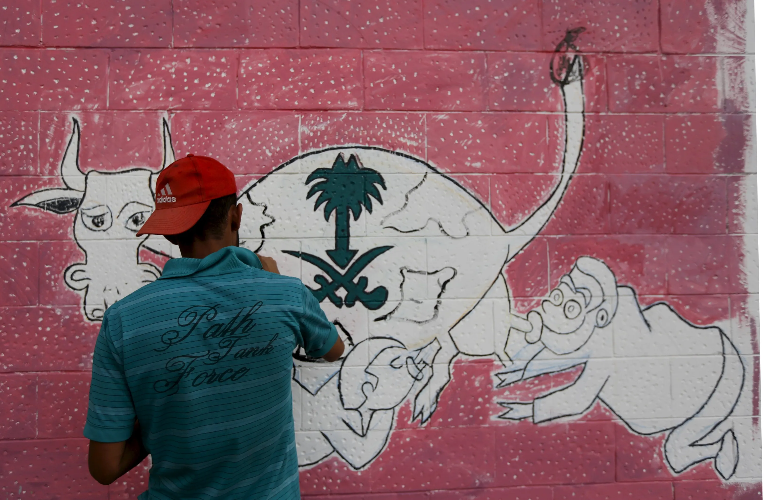 A pro-Houthi activist paints graffiti during a campaign against Saudi-led air strikes on the wall of the Saudi embassy in Sanaa August 2, 2015. (Photo by Khaled Abdullah/Reuters