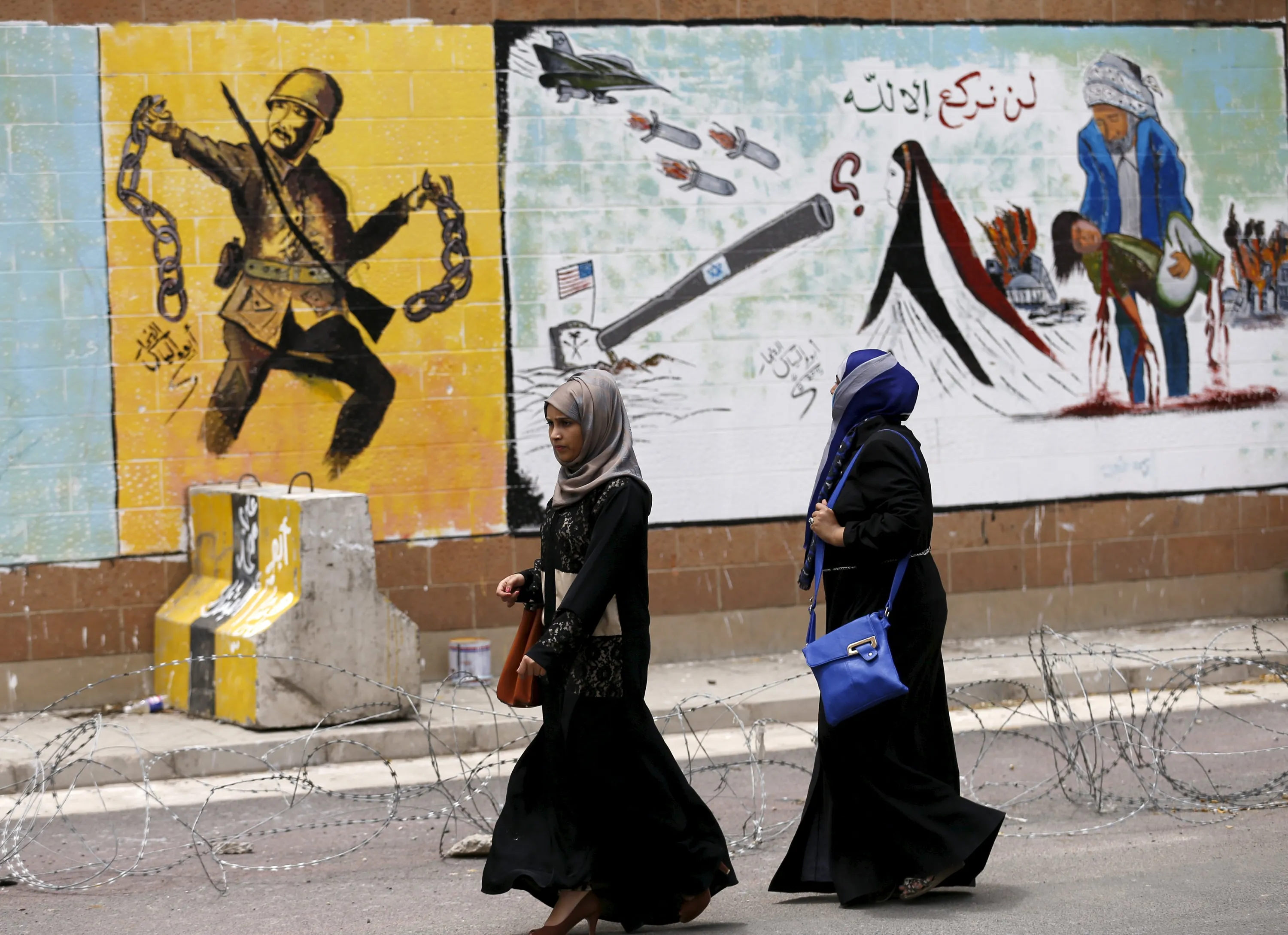 Women walk past graffiti painted by pro-Houthi activists on the wall of the Saudi embassy in Yemen's capital Sanaa August 18, 2015. The writing reads, “We will not bow down but to Allah”. (Photo by Khaled Abdullah/Reuters