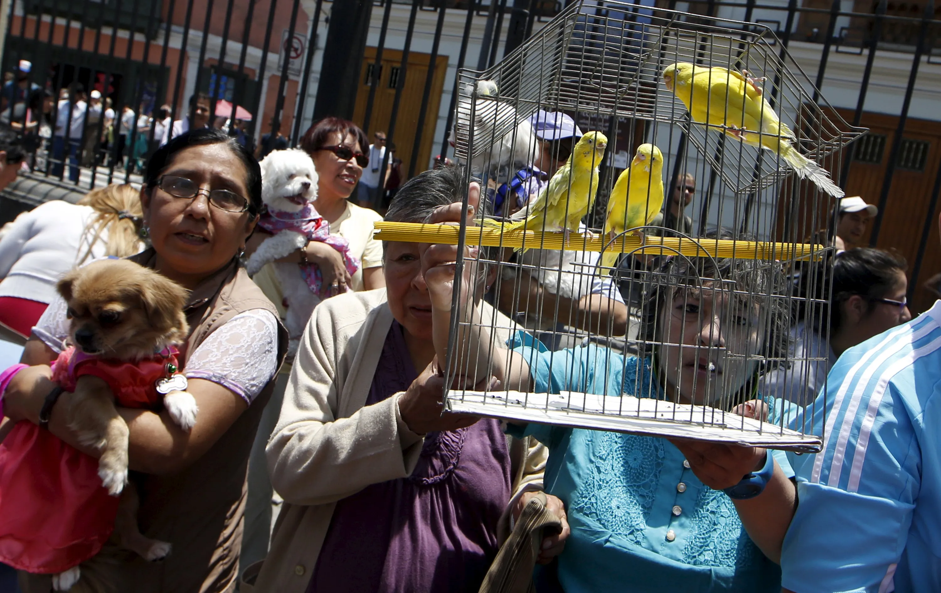 Owners hold their pets as they wait for blessings outside the San Francisco church in Lima, October 4, 2015. (Photo by Mariana Bazo/Reuters)