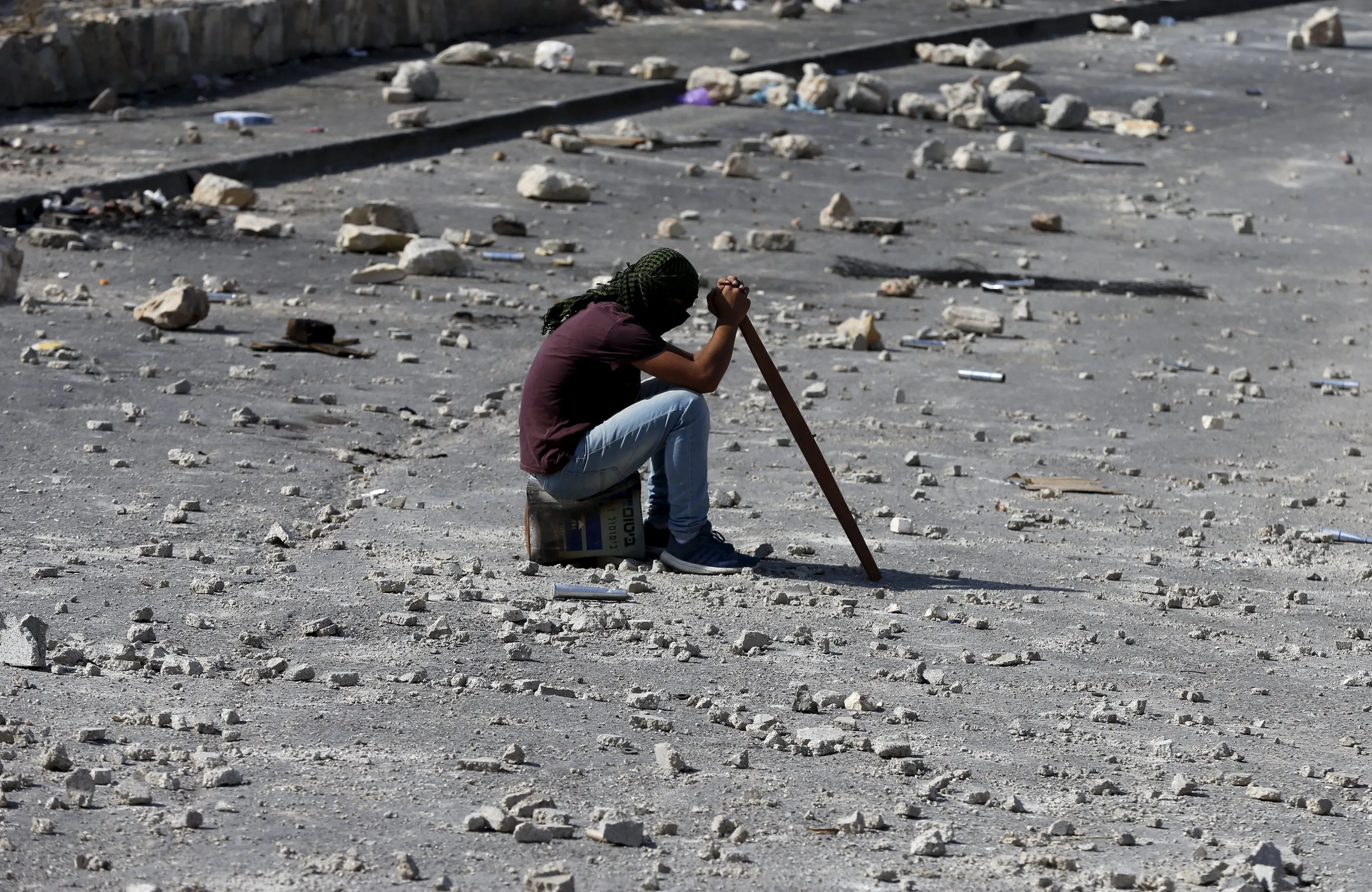 A Palestinian protester sits on a road during clashes with Israeli police in the east Jerusalem neighbourhood of Issawiya October 4, 2015. A Palestinian man stabbed and killed two Israelis in Jerusalem's Old City on Saturday before police shot him dead, officers said, amid an uptick in violence in the city and occupied West Bank. According to local media, the two men who were killed were identified as Nehemia Lavi, 41, of Jerusalem and Aharon Bennett, 21, of Beitar Illit. (Photo by Ammar Awad/Reuters)