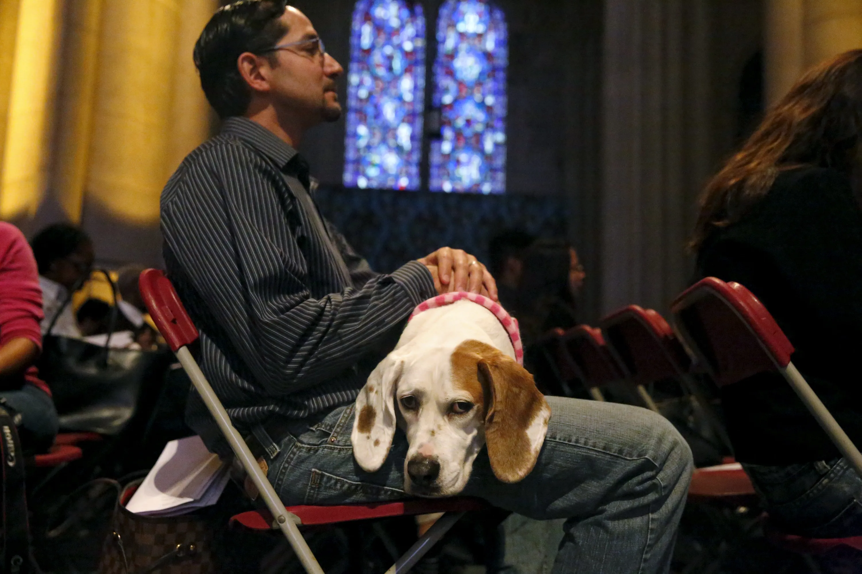 Luis Zapata and dog, Binky, attend the 31st annual Feast of Saint Francis and Blessing of the Animals at The Cathedral of St. John the Divine in the Manhattan borough of New York on October 4, 2015. (Photo by Elizabeth Shafiroff/Reuters)