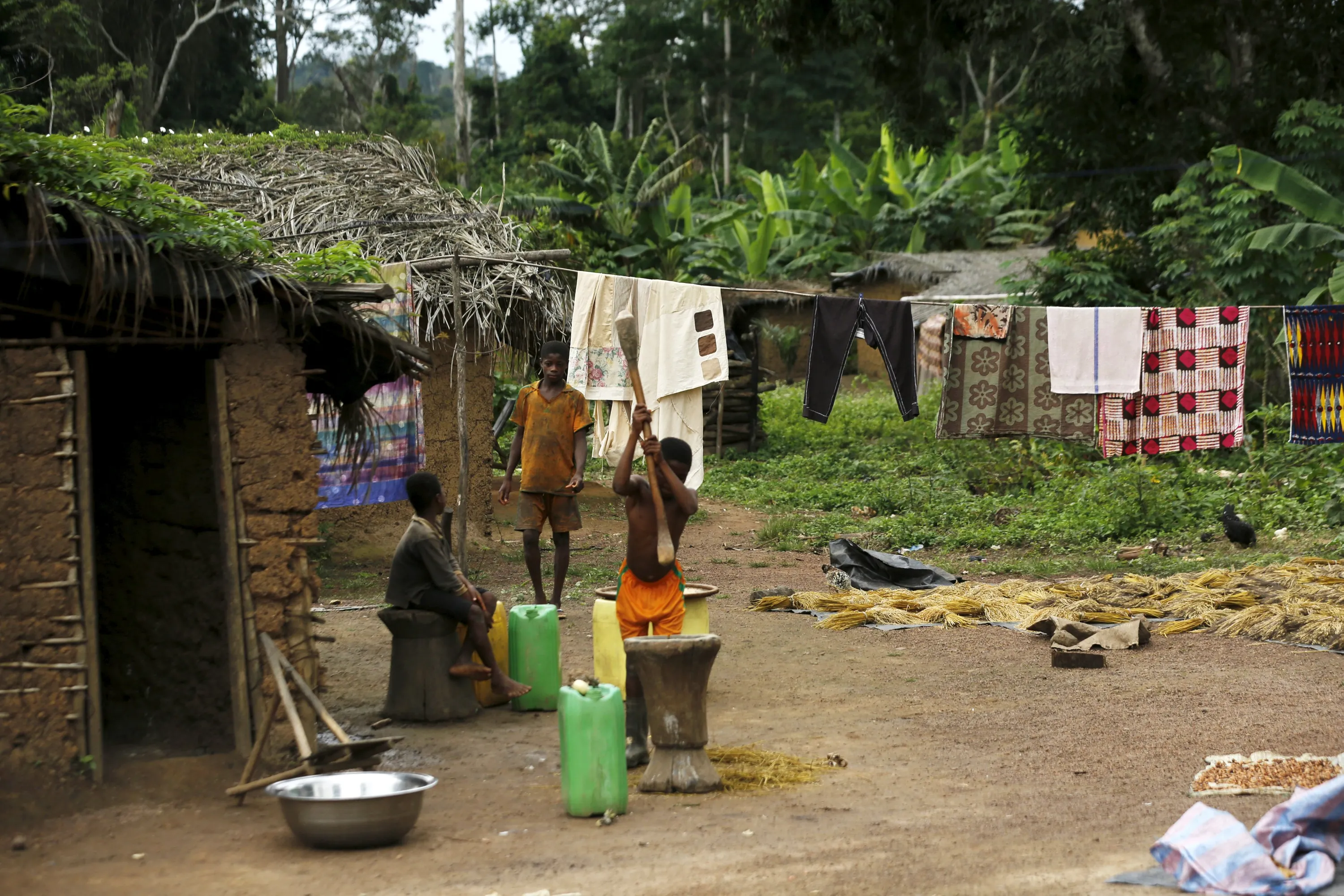 A boy uses a mortar and pestile in a village built inside the protected Gouin-Debe forest in Blolequin department, western Ivory Coast August 17, 2015. (Photo by Luc Gnago/Reuters)