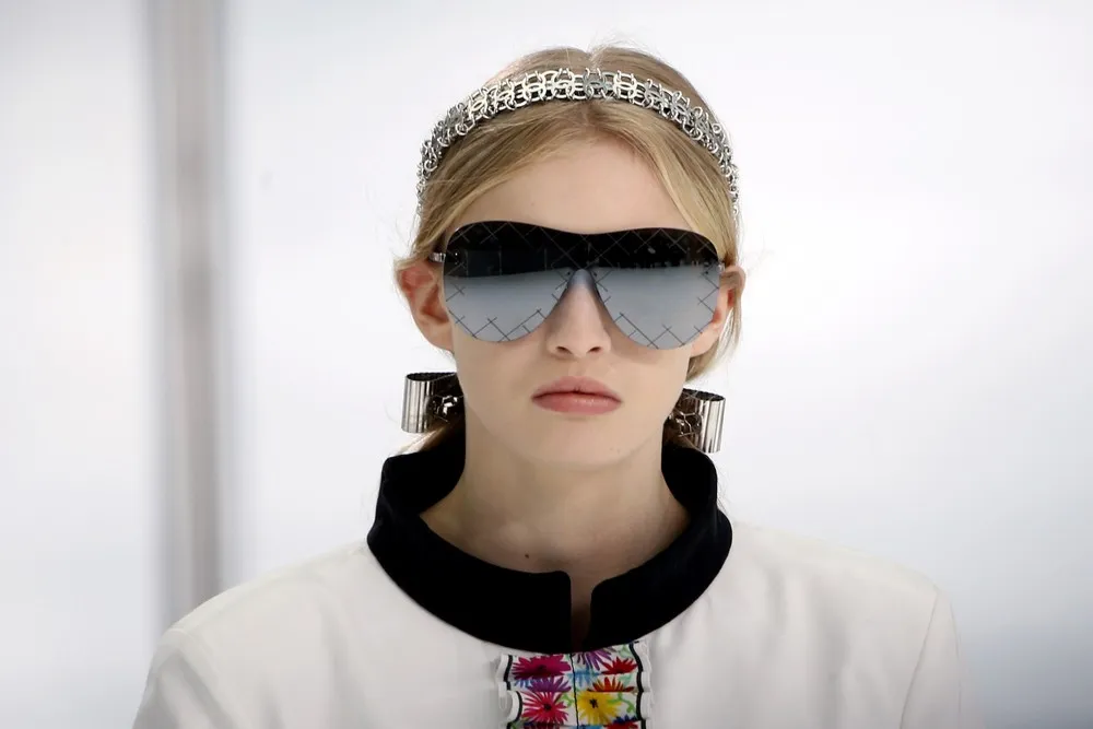 A model presents a creation by German designer Karl Lagerfeld as part of his Spring/Summer 2016 women's ready-to-wear collection for French fashion house Chanel at the Grand Palais which is transformed into a Chanel airport during the Fashion Week in Paris, France, October 6, 2015. (Photo by Charles Platiau/Reuters)
