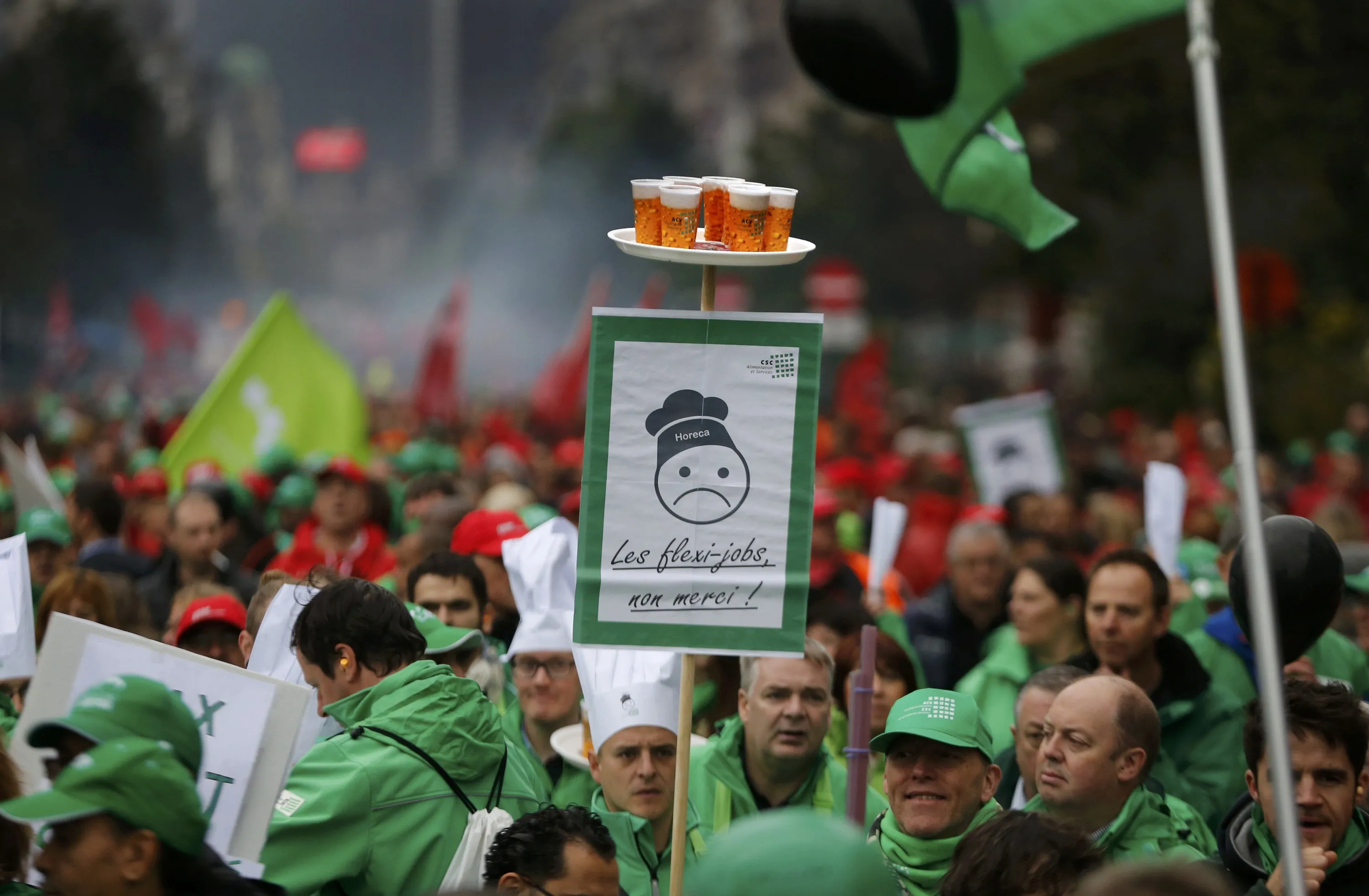 Demonstrators protesting government reforms and cost-cutting measures march in central Brussels, October 7, 2015. The sign reads "Flexi-jobs, no thanks!". (Photo by Francois Lenoir/Reuters)