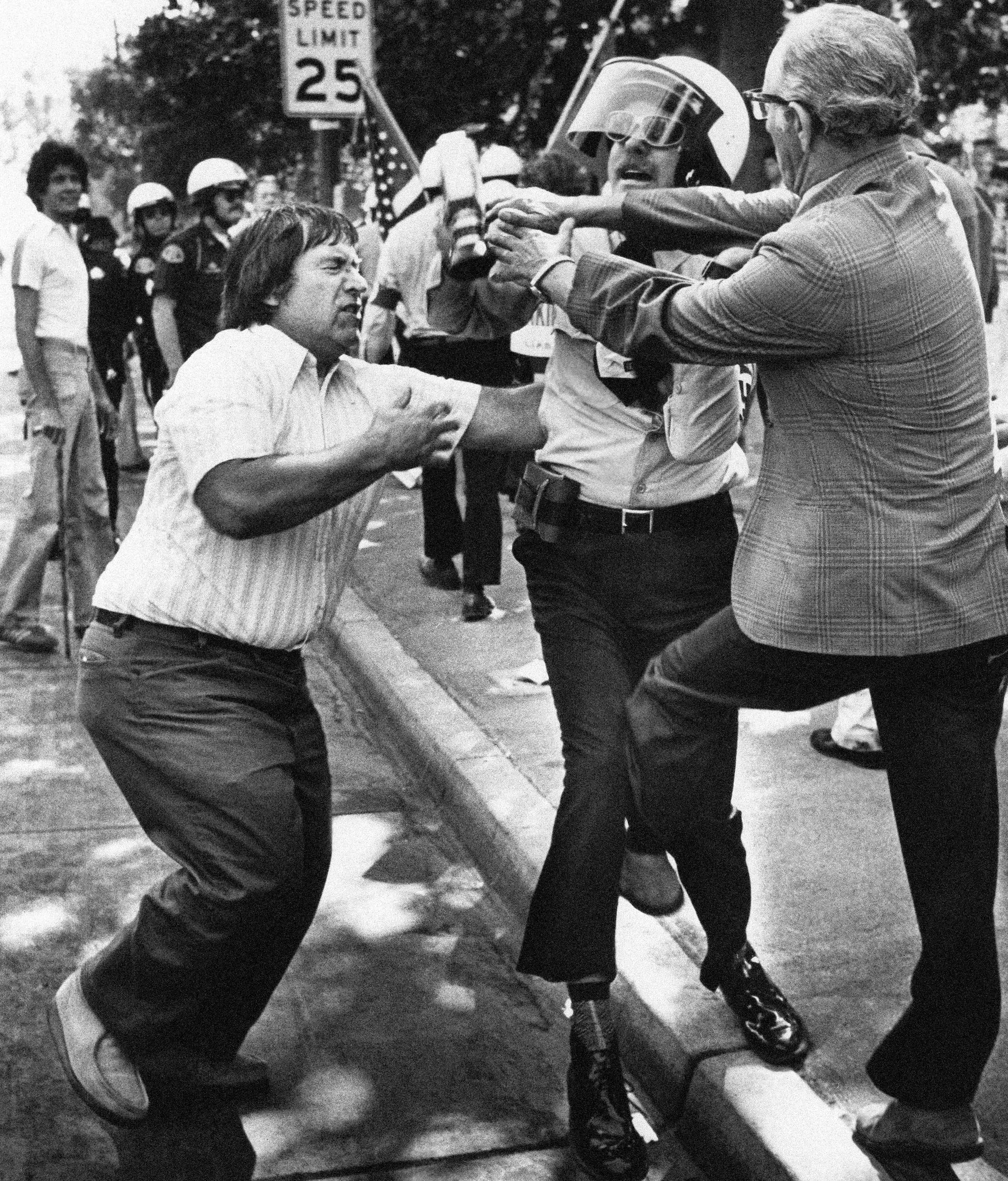 A Nazi demonstrator fights with anti-Nazi protestors during a demonstration by the National Socialist White Workers Party at St. James Park in San Jose, Calif., October 8, 1977. Eight uniformed Nazis dodged eggs, tomatoes, sticks and fists, as an angry crowd of 2,000 made pandemonium of the white-power demonstration. (Photo by Paul C. Strong/AP Photo)