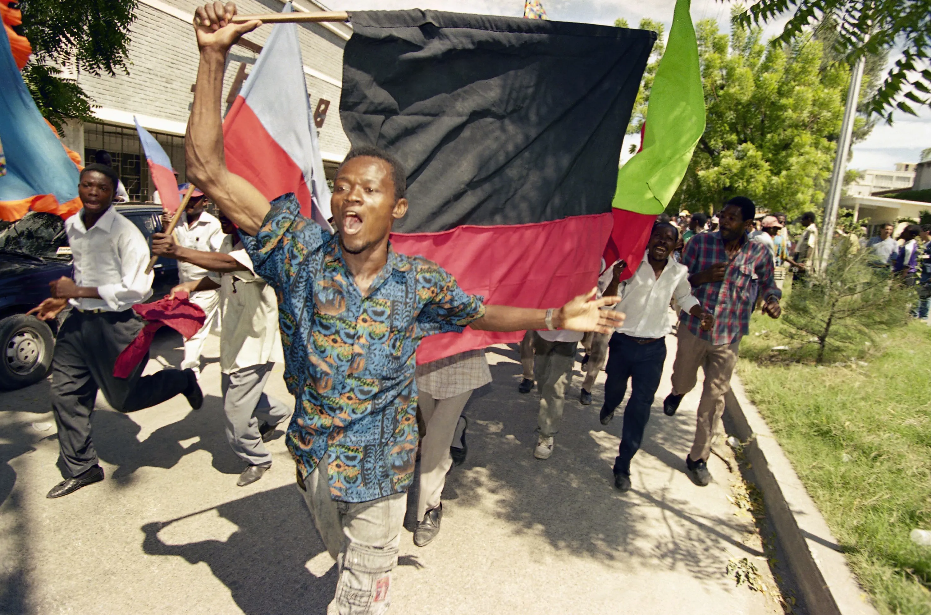 Haitian armed civilians, called attaches, run through a Port-au-Prince street carrying the black and red flag of former dictator Francois Papa Doc Duvalier as they demonstrate against the return of ousted Haitian President Jean-Bertrand Aristide and against the U.N. mission in downtown Port-au-Prince, Haiti on Friday, October 8, 1993. Aristide is scheduled to be returned to power by the end of October. (Photo by Michael Stravato/AP Photo)