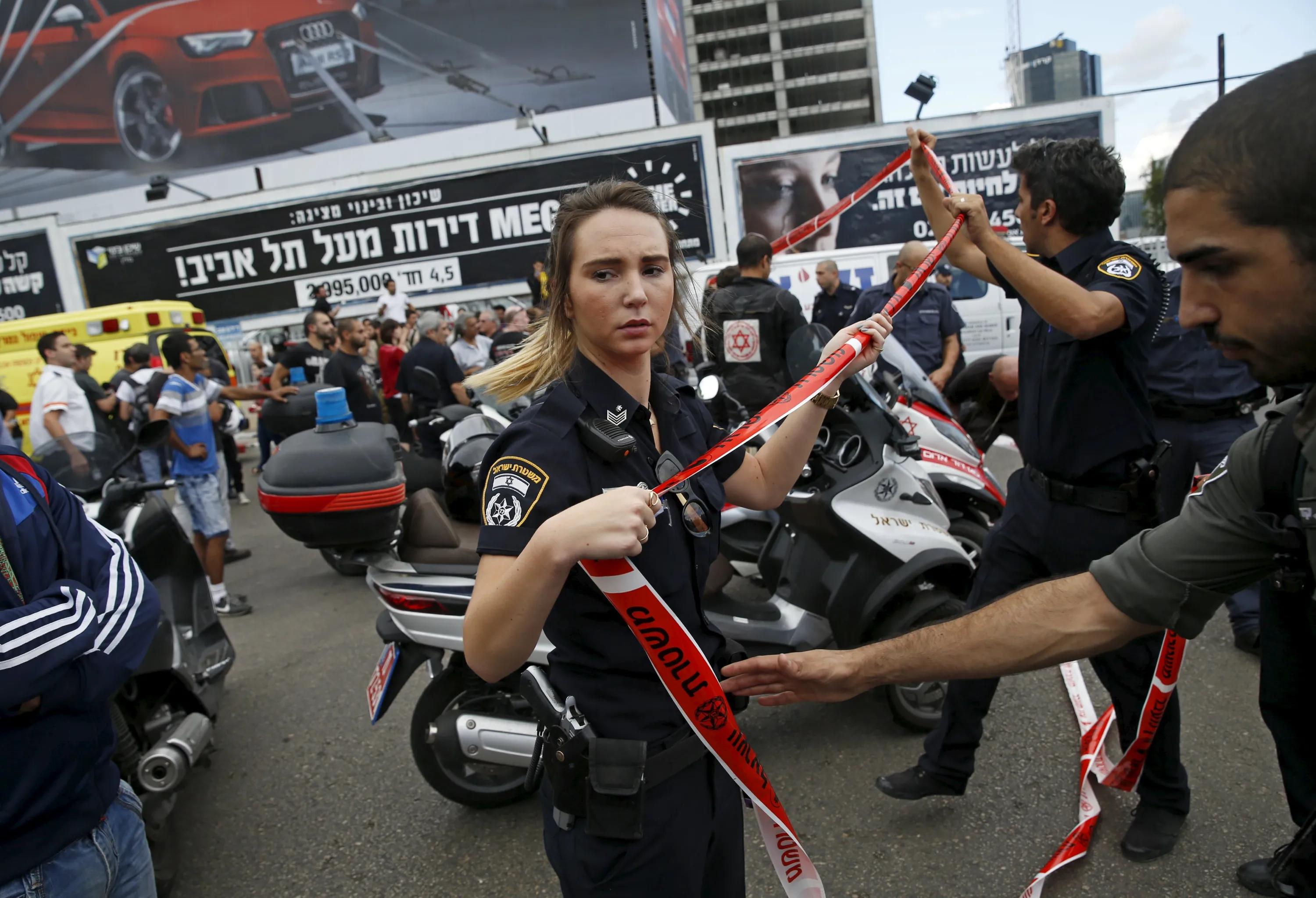 Israeli police officers cordon off a street at the scene of a stabbing attack in Tel Aviv, Israel October 8, 2015. (Photo by Baz Ratner/Reuters)