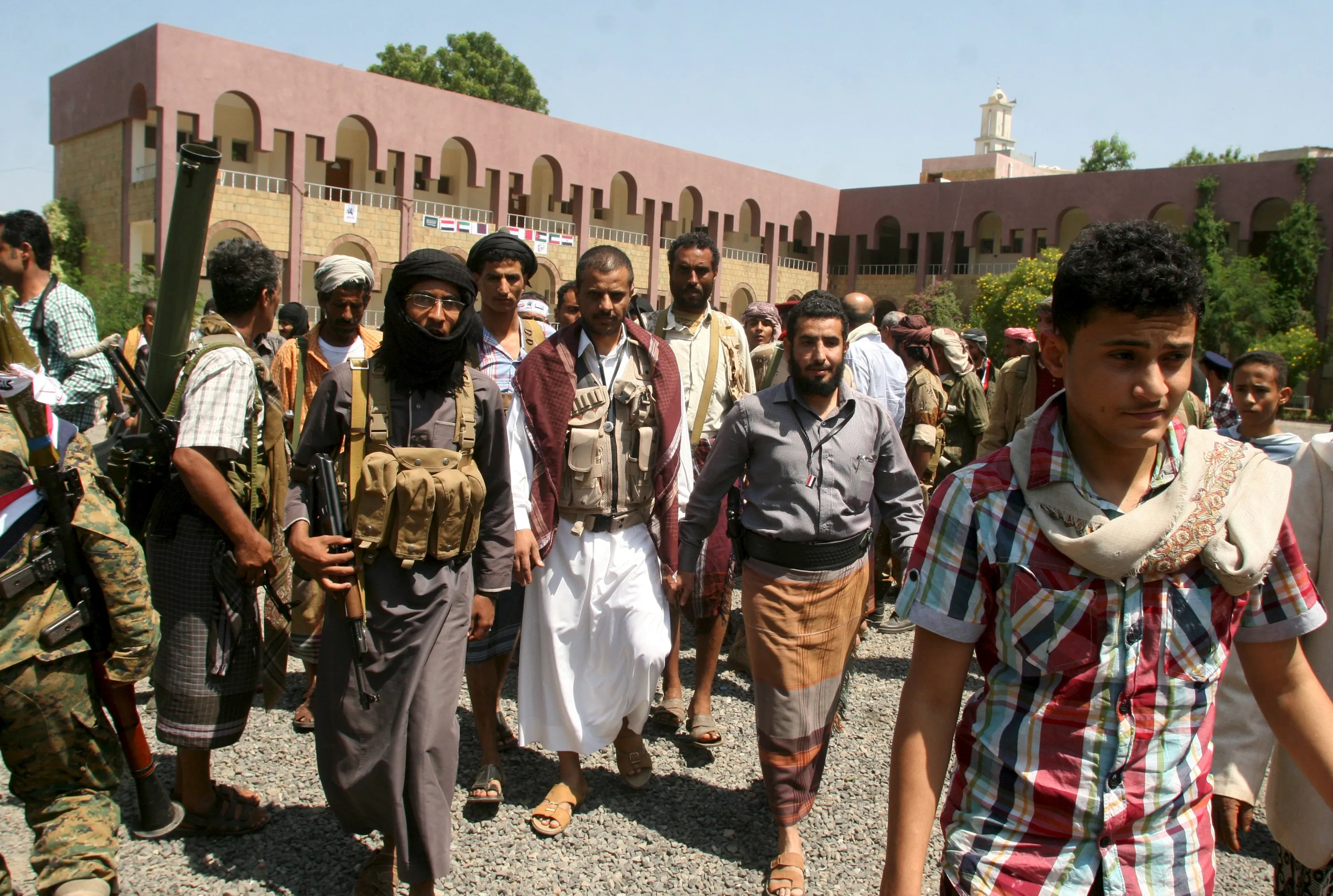 Armed fighters of the Popular Resistance Committees escort their leader Hammoud Al-Mikhlafi (C) during a graduation ceremony of the affiliate special forces of the resistance, in Yemen's southwestern city of Taiz October 8, 2015. (Photo by Reuters/Stringer)