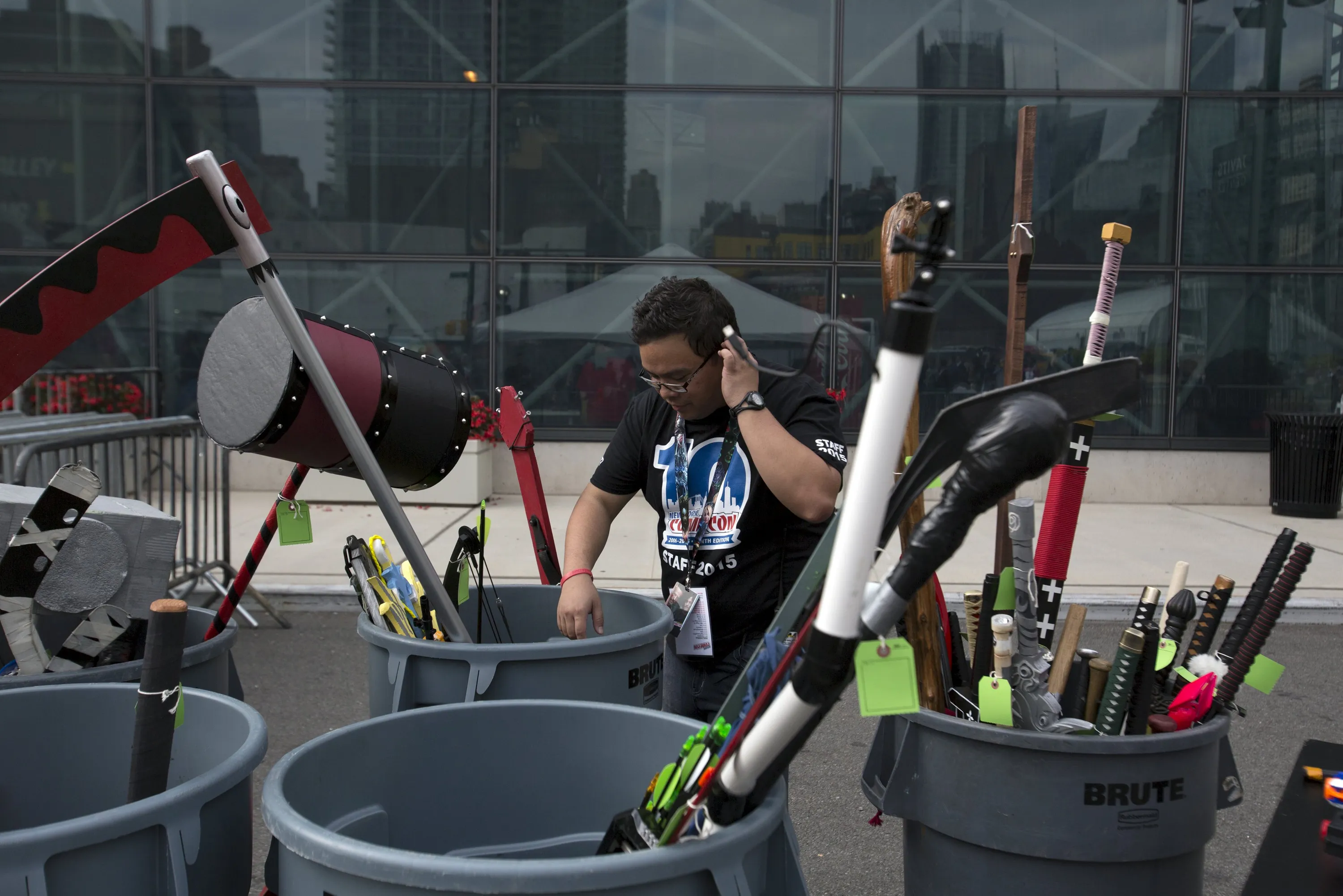 A man sorts through confiscated weapons at New York Comic Con in Manhattan, New York, October 8, 2015. (Photo by Andrew Kelly/Reuters)