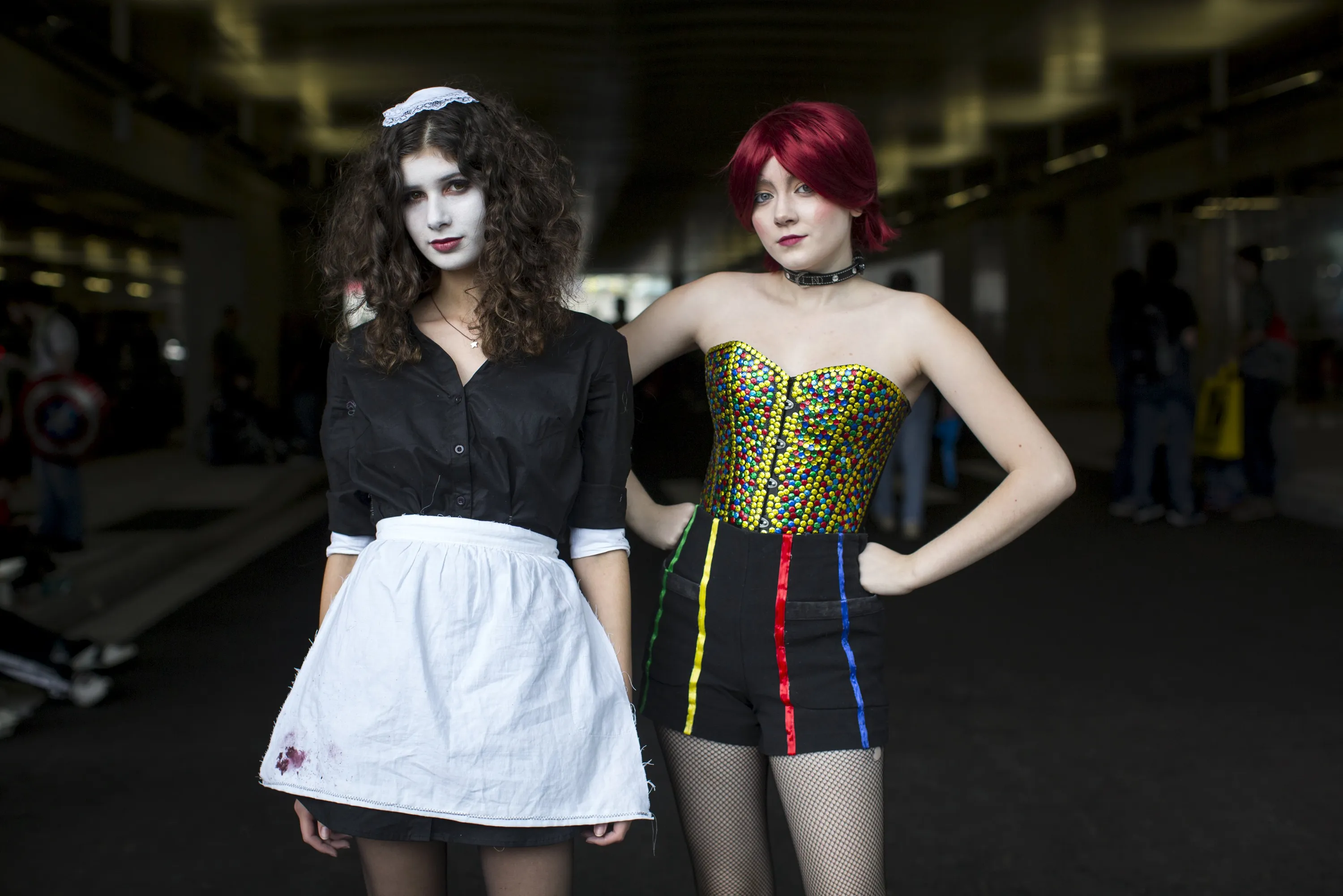 Olivia Alicandri dressed as Magenta and Olivia Viteznik dressed as Columbia, both characters from Rocky Horror Picture Show, pose for photos on day two of New York Comic Con in Manhattan, New York, October 9, 2015. (Photo by Andrew Kelly/Reuters)