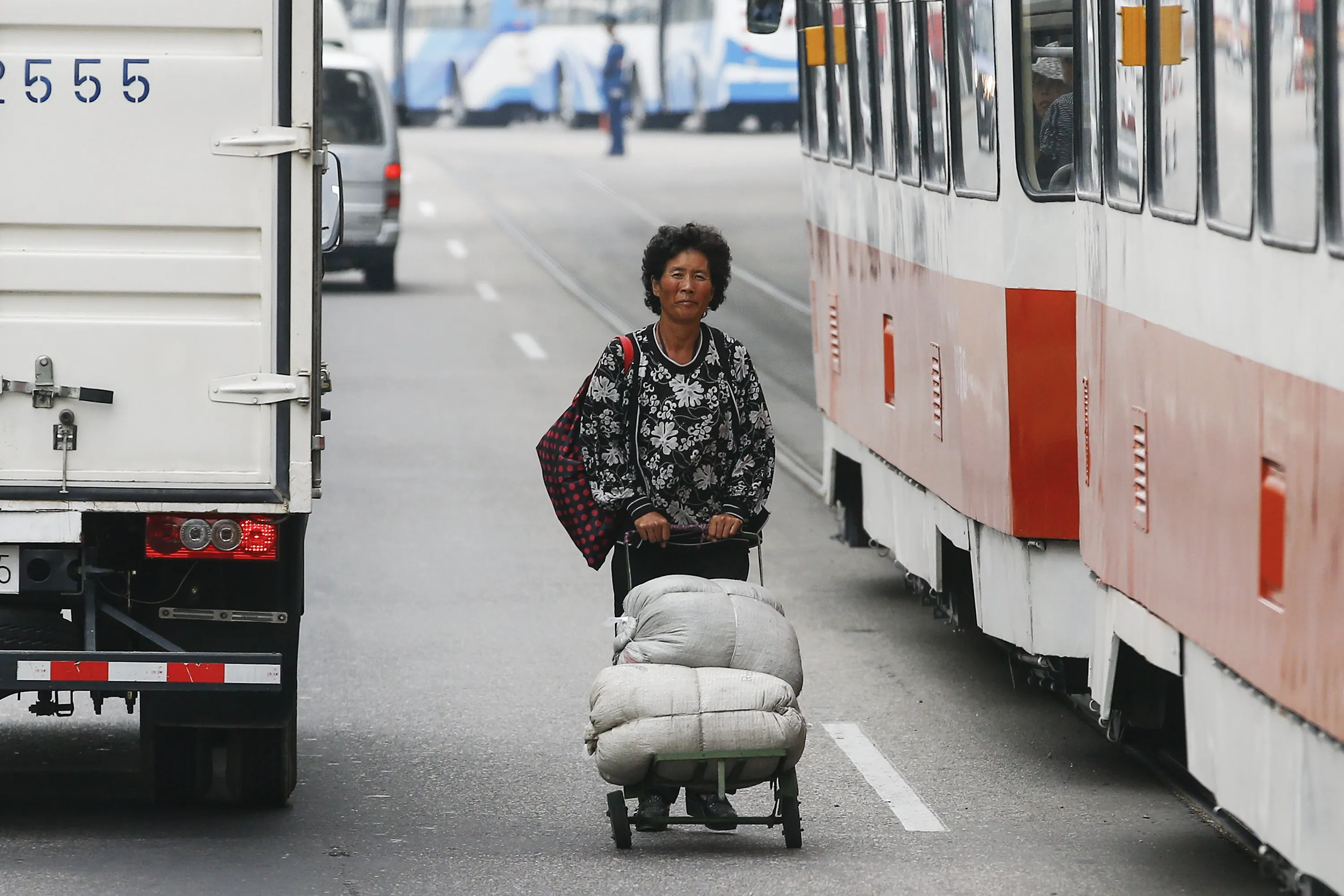 A woman pushes a cart between vehicles in downtown Pyongyang, North Korea October 8, 2015. Smartphones, traffic jams and modern, energy-saving lights casting a dim glow on the streets - North Korea's capital shows signs of change even as it prepares for a pageant of military muscle and propaganda of the kind the country is know for. (Photo by Damir Sagolj/Reuters)