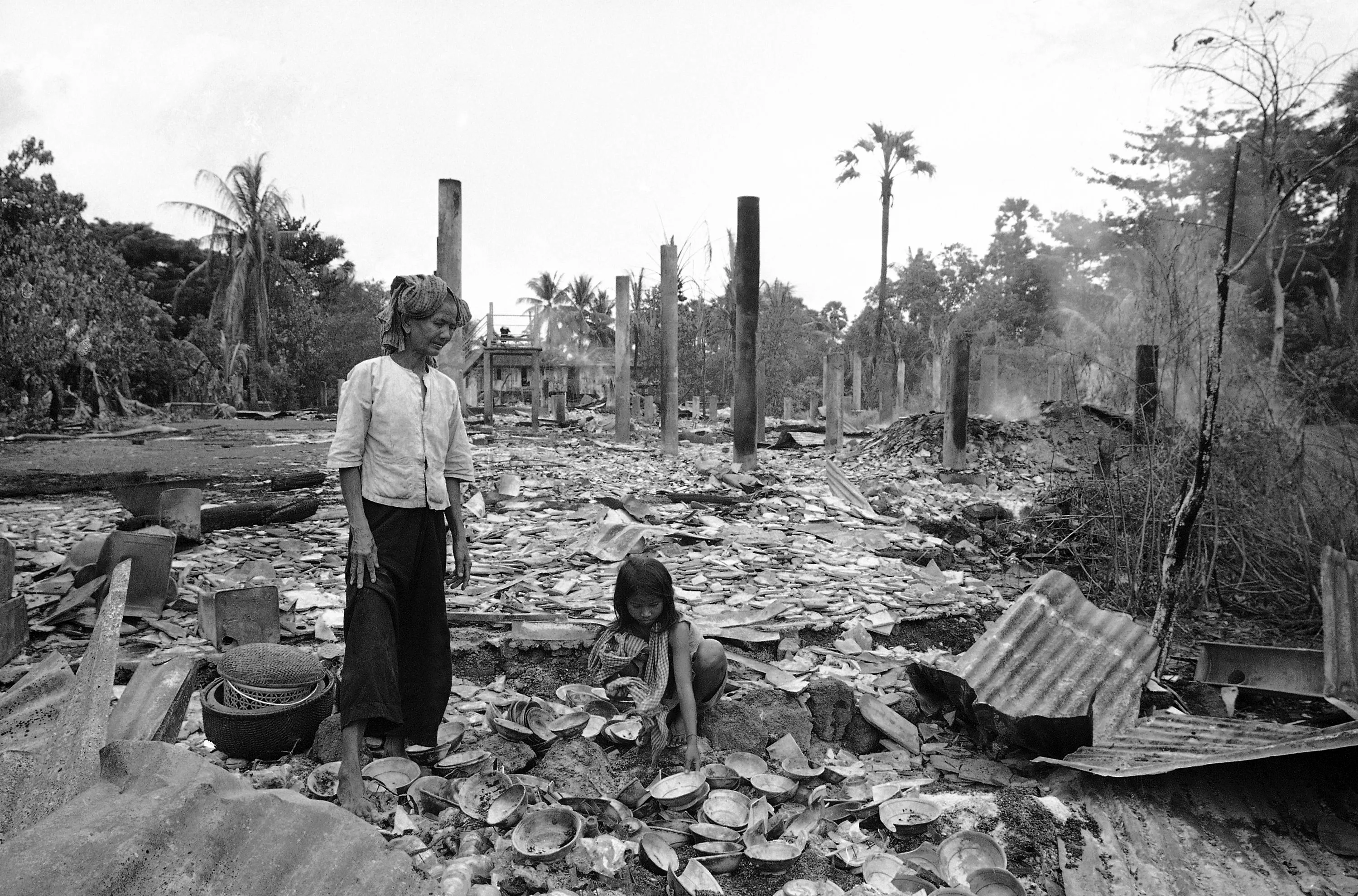 Cambodian woman and a little girl try to salvage belongings from what was once their home in Taing Kauk, about 47 miles North of Phnom Penh on October 9, 1970. Enemy forces occupied the village, then repulsed a Cambodian counter attack. The Cambodian forces used air and artillery strikes to drive the enemy out, resulting in flattening almost the entire village. The villagers had fled when the enemy arrived. (Photo by Ghislain Bellorget/AP Photo)