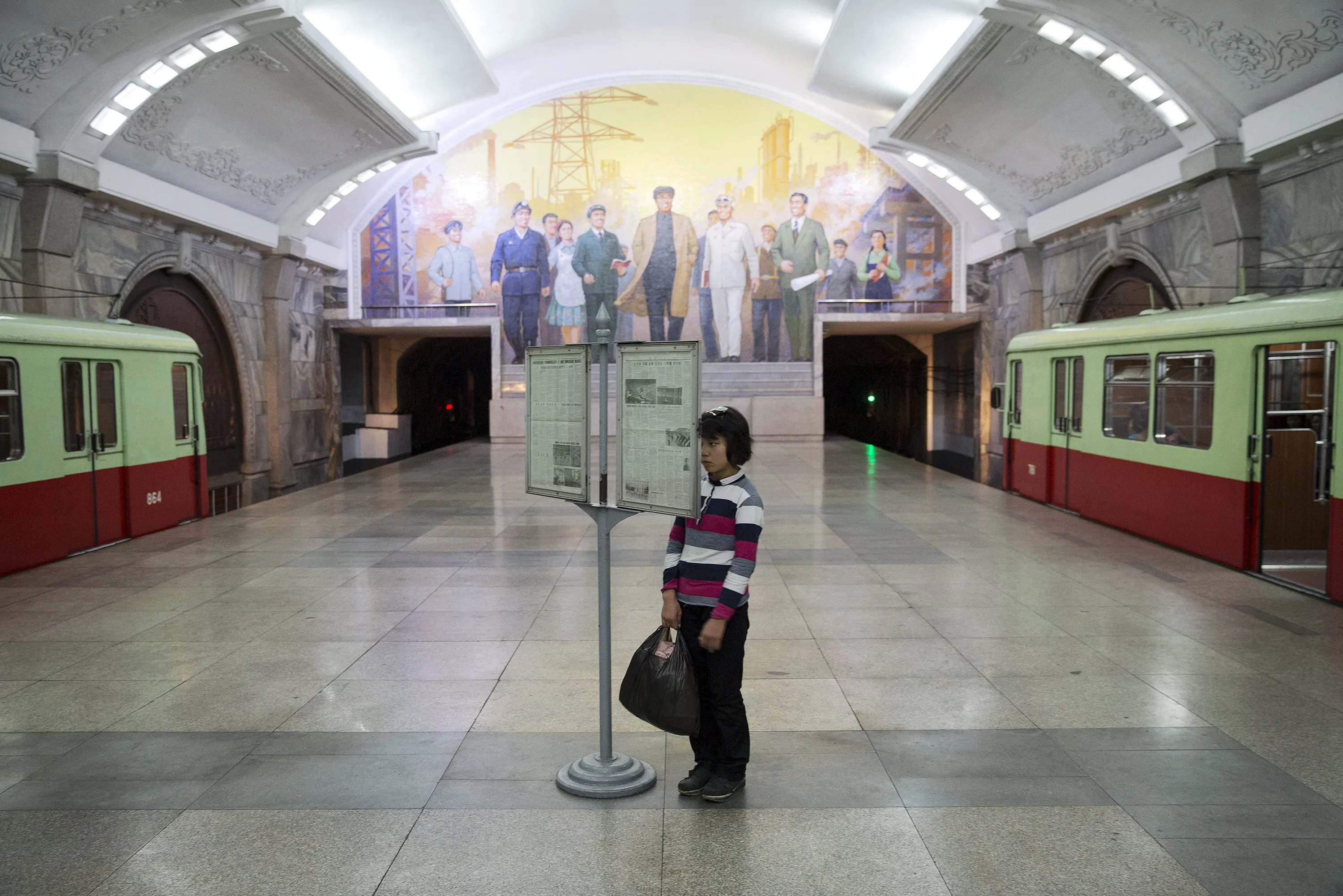 A young woman reads newspapers displayed inside a subway station visited by foreign reporters during a government organised tour in Pyongyang, North Korea October 9, 2015. (Photo by Damir Sagolj/Reuters)