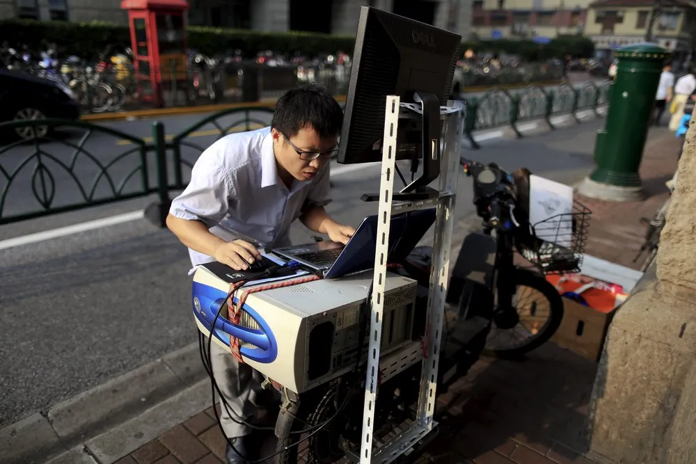 Yue Banghai checks on his laptop on the back of his electric bike at a “street stock salon” in central Shanghai, China, September 5, 2015. Yue is a businessman who's been selling futures and stock analysis software for five years. Every weekend, when is not raining, Yue rides electronic bike to the salon where he offers his software using a computer attached to the back seat of his bike. For at least a decade, an area next to the People’s Square temporarily has transformed itself into a "street stock salon" during weekends, with investors from all over Shanghai coming to gather stock information and learn trading skills from others. A few businessmen also make use of the occasion to promote their stock analysis software. (Photo by Aly Song/Reuters)