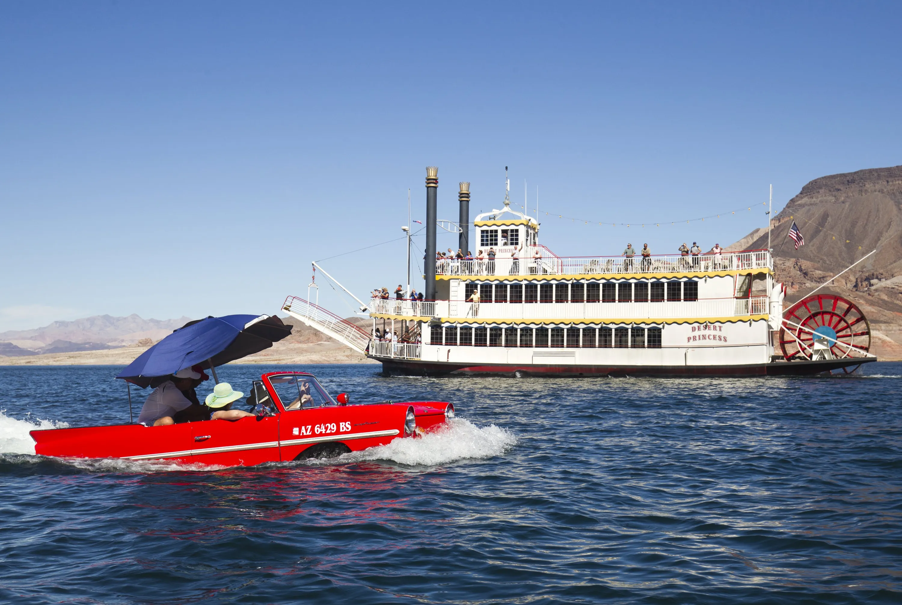A 1963 Amphicar, driven by Rob Vondracek of Fountain Hills, Arizona, passes by a sightseeing paddleboat during the first Las Vegas Amphicar Swim-in at Lake Mead near Las Vegas, Nevada October 9, 2015. (Photo by Steve Marcus/Reuters)