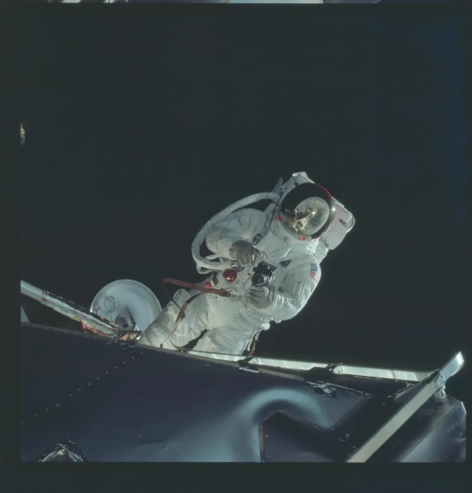 Astronaut Russell L. Schweickart, lunar module pilot, operates a 70mm Hasselblad camera during his extravehicular activity (EVA) on the fourth day of the Apollo 9 Earth-orbital mission in this March 6, 1969 NASA handout photo. (Photo by Reuters/NASA)