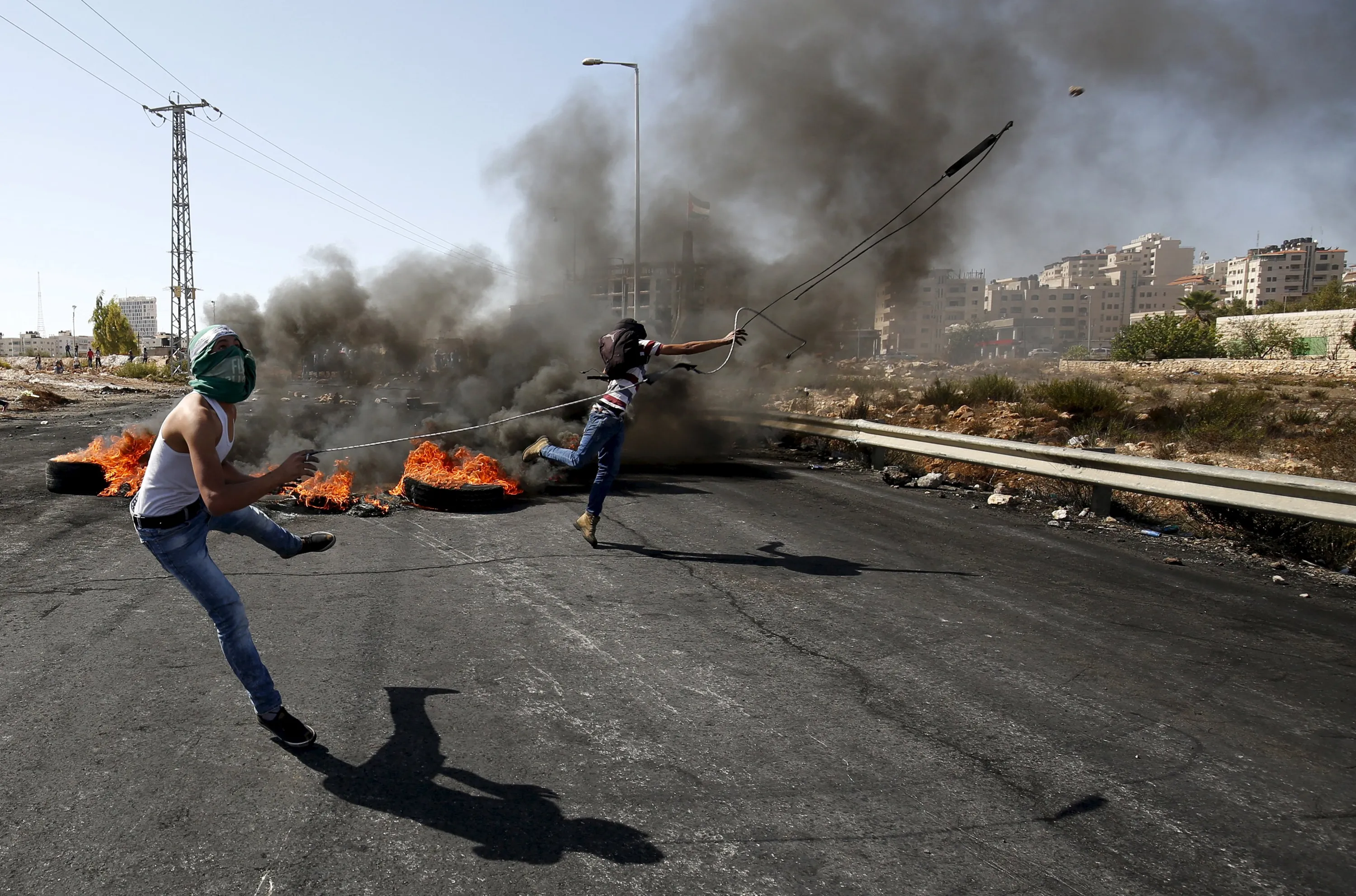 Palestinian protesters use a sling to hurl stones at Israeli troops during clashes near the Jewish settlement of Bet El, near the West Bank city of Ramallah, October 11, 2015. Four Israelis and 23 Palestinians have died in 12 days of bloodshed fueled in part by Muslim anger over increasing Jewish access to the al-Aqsa mosque compound in Jerusalem. Violence has spread from the holy city and the Israeli-occupied West Bank to Israel's interior and Hamas-ruled Gaza. (Photo by Mohamad Torokman/Reuters)