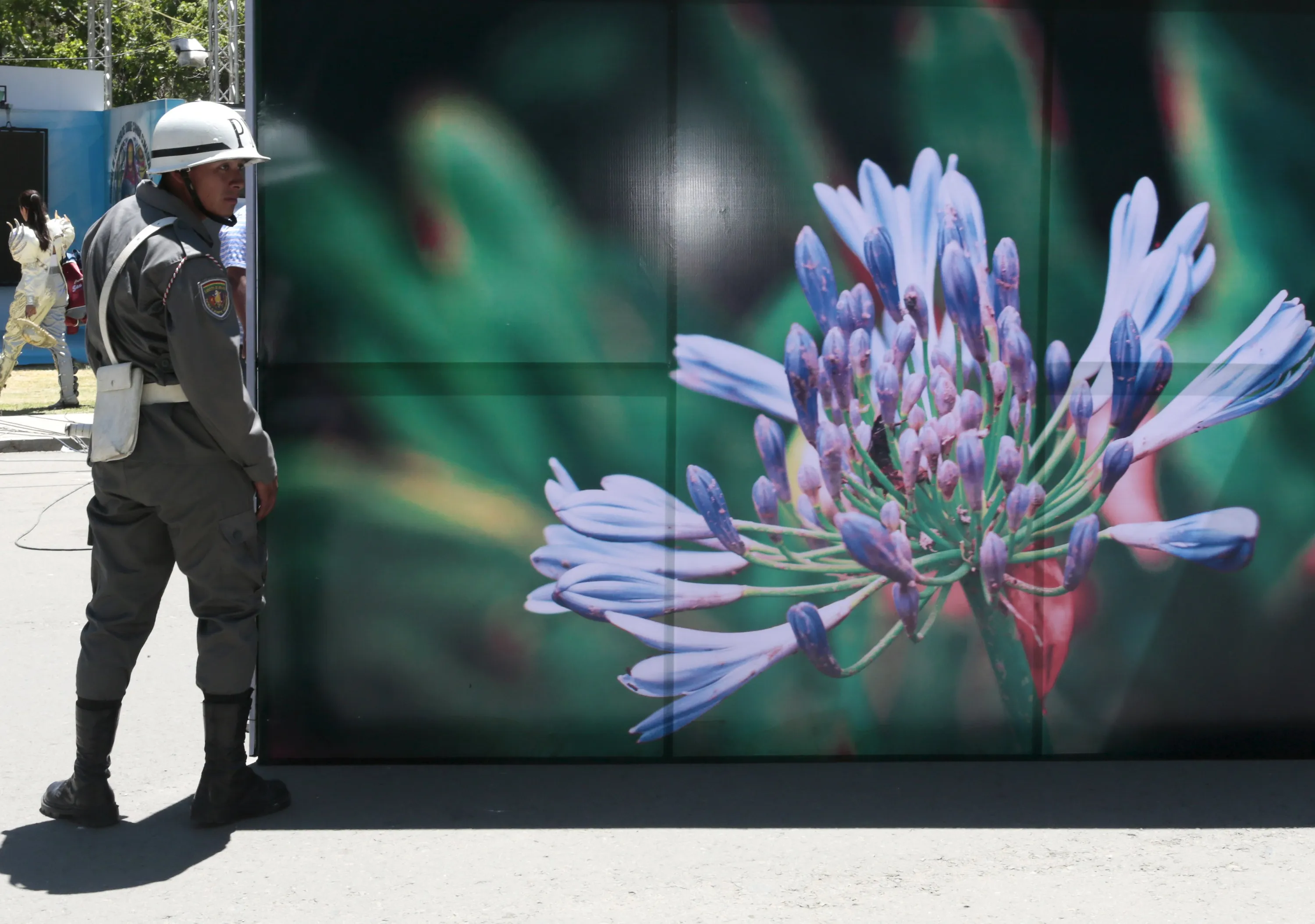 A soldier stands next to a banner with an image of a flower at the World People's Conference on Climate Change and the Defense of Life, prior to the World Climate Change Conference, in Tiquipaya, Bolivia, October 10, 2015. (Photo by David Mercado/Reuters)