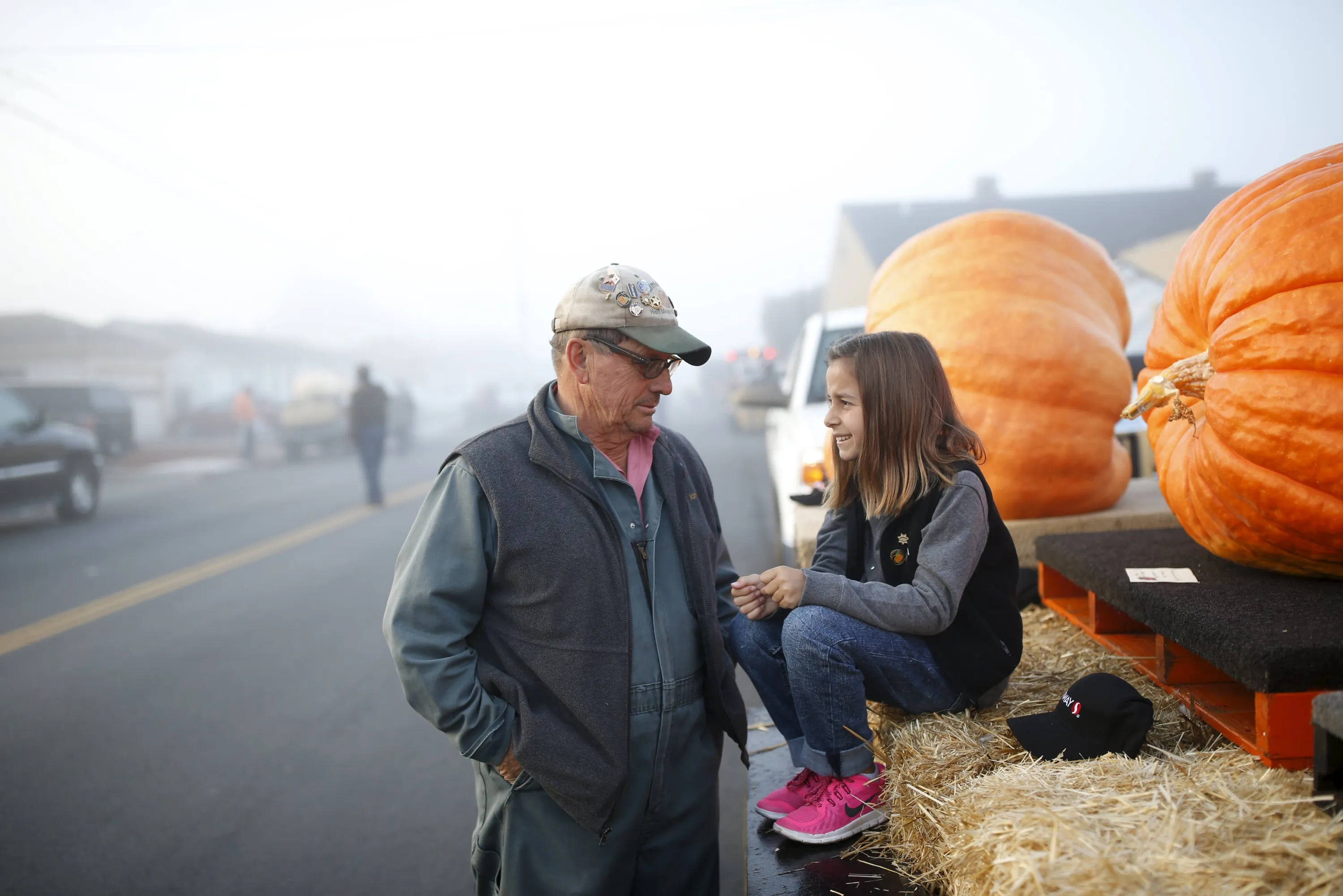 Farmer John (L) speaks with his granddaughter Delfina Bianchi, 7, as they wait next to their pumpkins during the annual Safeway World Championship Pumpkin Weigh-off in Half Moon Bay, California October 12, 2015. (Photo by Stephen Lam/Reuters)