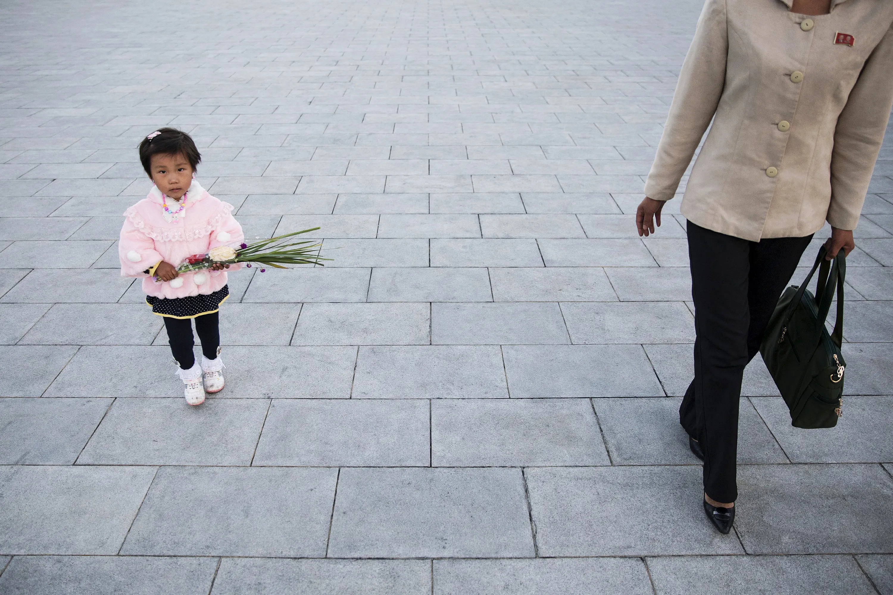 A woman and her daughter arrive to pay their respects at statues of North Korea founder Kim Il Sung and late leader Kim Jong Il in Pyongyang October 11, 2015. (Photo by Damir Sagolj/Reuters)