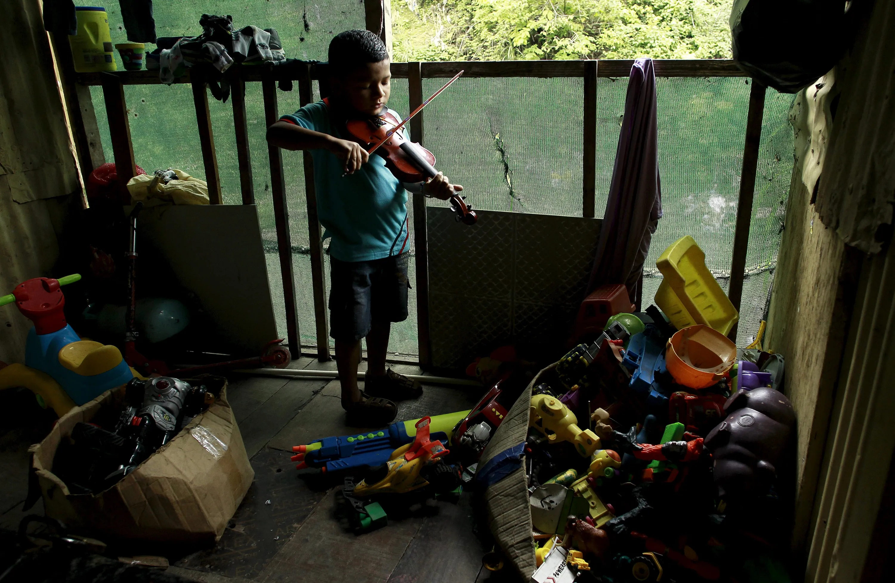 Ruben Escoriano, 6, practices in his house before his fiddle lesson at the Integral System of Artistic Education for Social Inclusion (SIFAIS) center in the poor neighborhood of La Carpio, Costa Rica October 8, 2015. (Photo by Juan Carlos Ulate/Reuters)