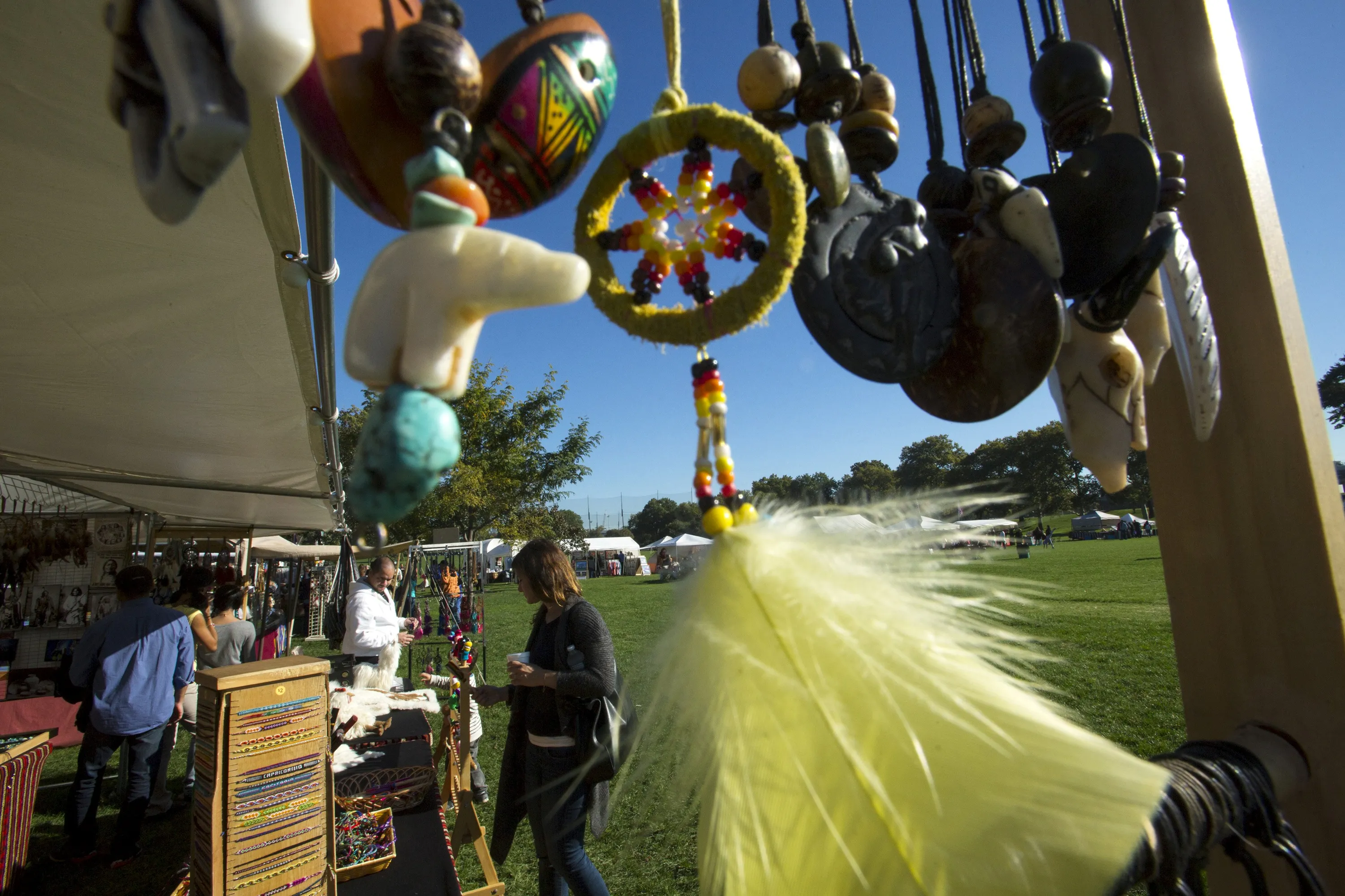 People buy indigenous stuff after a Sunrise Ceremony during a "pow-wow" celebrating the Indigenous Peoples Day Festival in Randalls Island, New York, October 12, 2015. (Photo by Eduardo Munoz/Reuters)