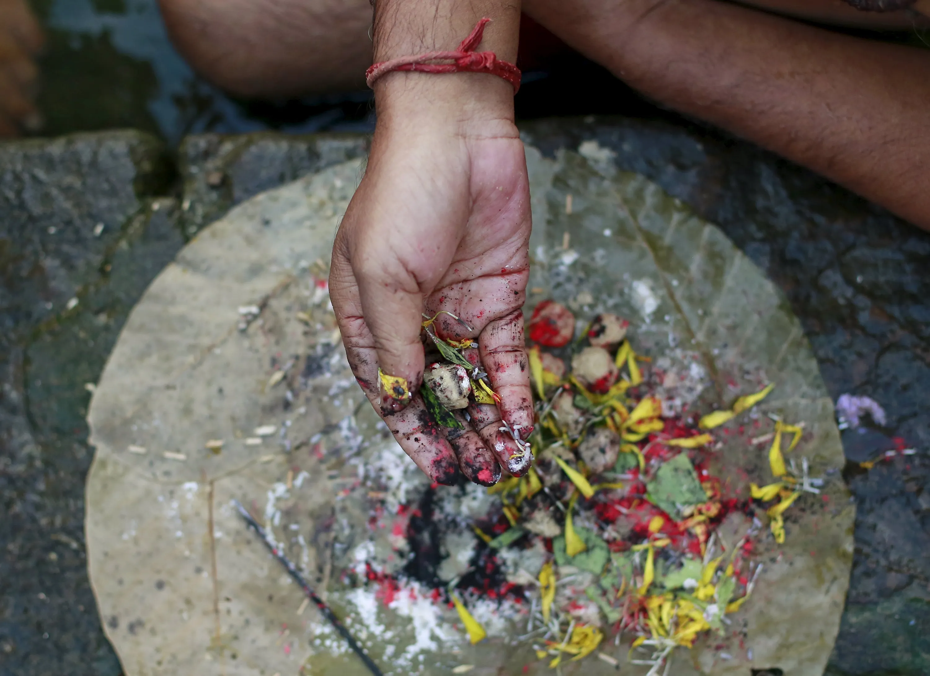 A Hindu devotee prays on the steps of a holy pond on the auspicious day of Mahalaya in Mumbai, India, October 12, 2015. (Photo by Danish Siddiqui/Reuters)
