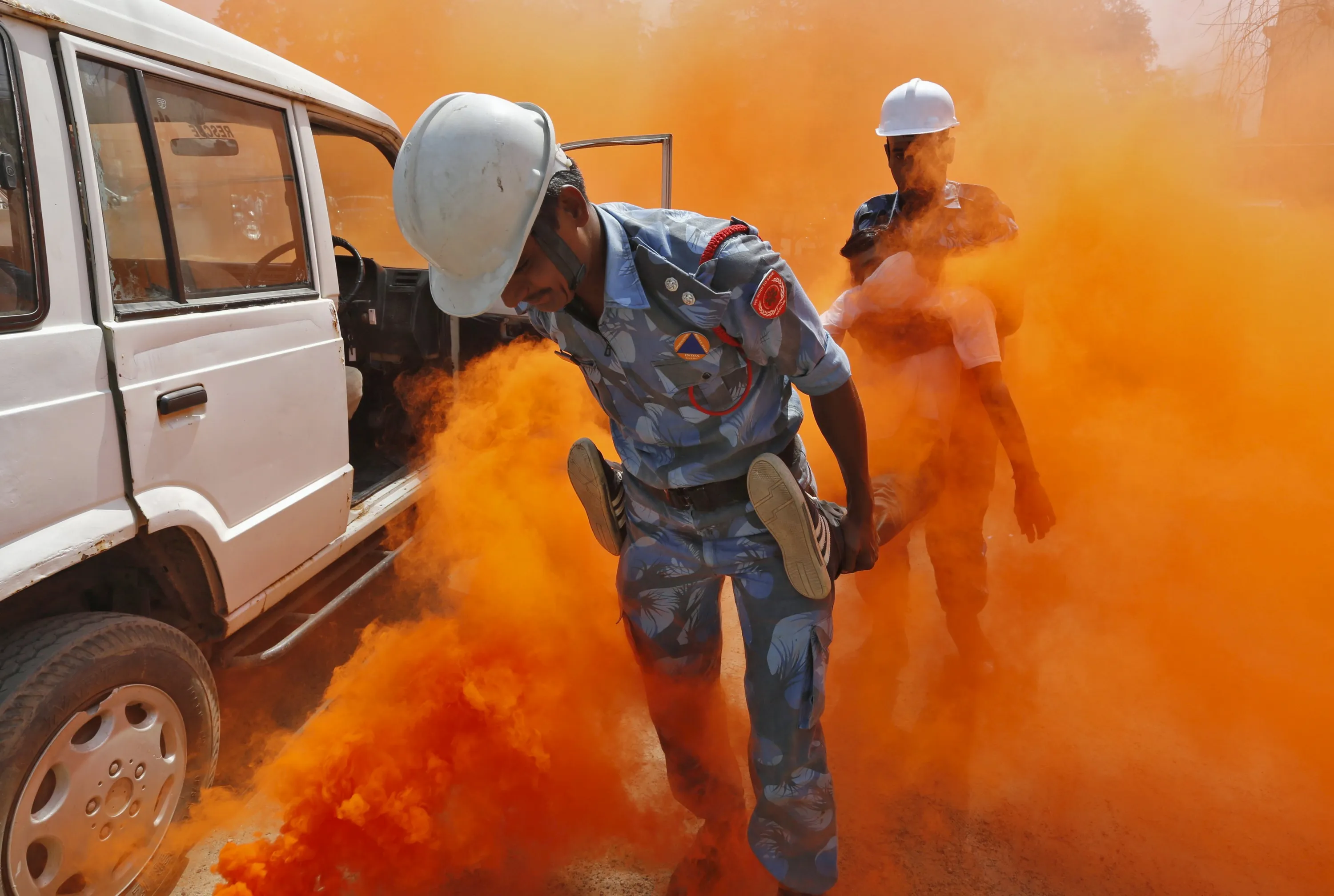 Members of a rescue team from the Gujarat State Disaster Management Authority (GSDMA) take part in a mock safety and rescue drill to mark the "International Day for Disaster Reduction", in Ahmedabad, India, October 13, 2015. (Photo by Amit Dave/Reuters)