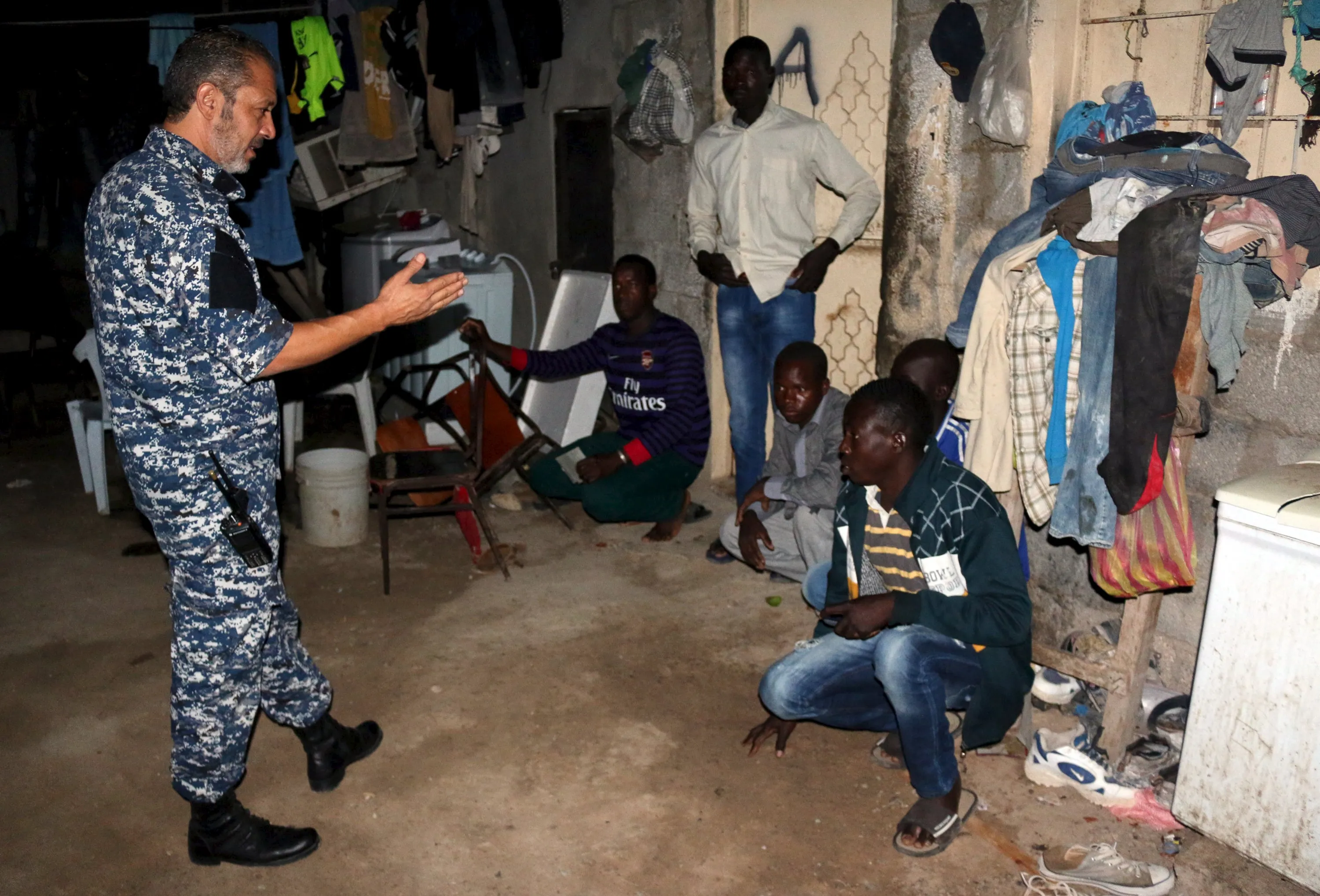 An officer of a Libyan anti-illegal immigrants unit gestures during an early morning raid on migrants at hideout in Tripoli, Libya, October 13, 2015. (Photo by Hani Amara/Reuters)