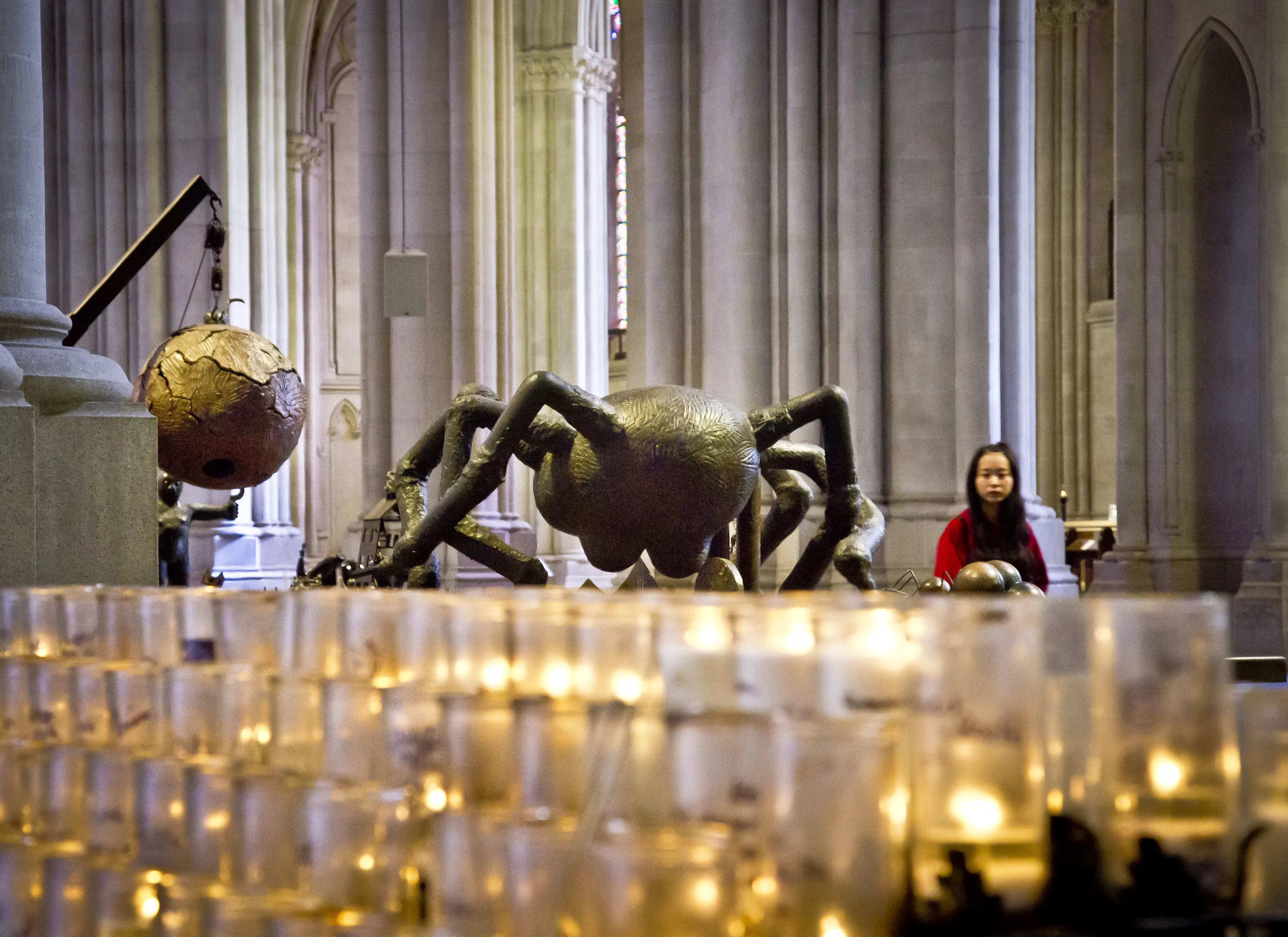 The steel and bronze sculpture "The Tables", by Tom Otterness, appears among the works of 30 artists in the multimedia exhibition "The Value of Food: Sustaining a Green Planet" at the Cathedral of St. John the Divine, Wednesday, October 7, 2015, in New York. (Photo by Bebeto Matthews/AP Photo)