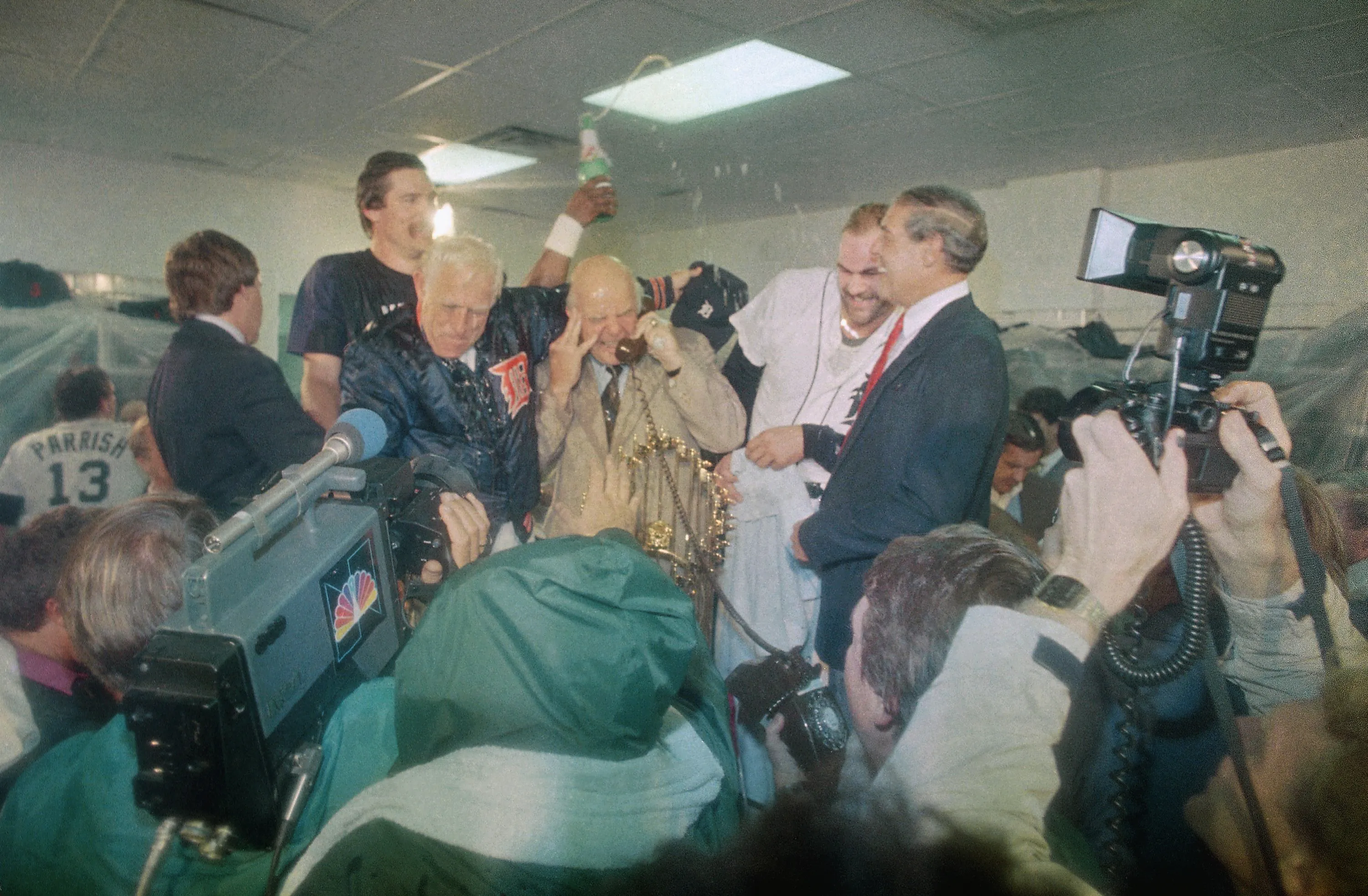 Jim Campbell, President of the Detroit Tigers, center, takes a call from Pres. Ronald Reagan after the Tigers won the World Series, Sunday, October 14, 1984, Detroit, Mich. Pitcher Jack Morris pours champagne over Campbell as manager Sparky Anderson, left, looks on. Others are Kirk Gibson and Bill Lajoie, general manager, right. (Photo by Richard Sheinwald/AP Photo)