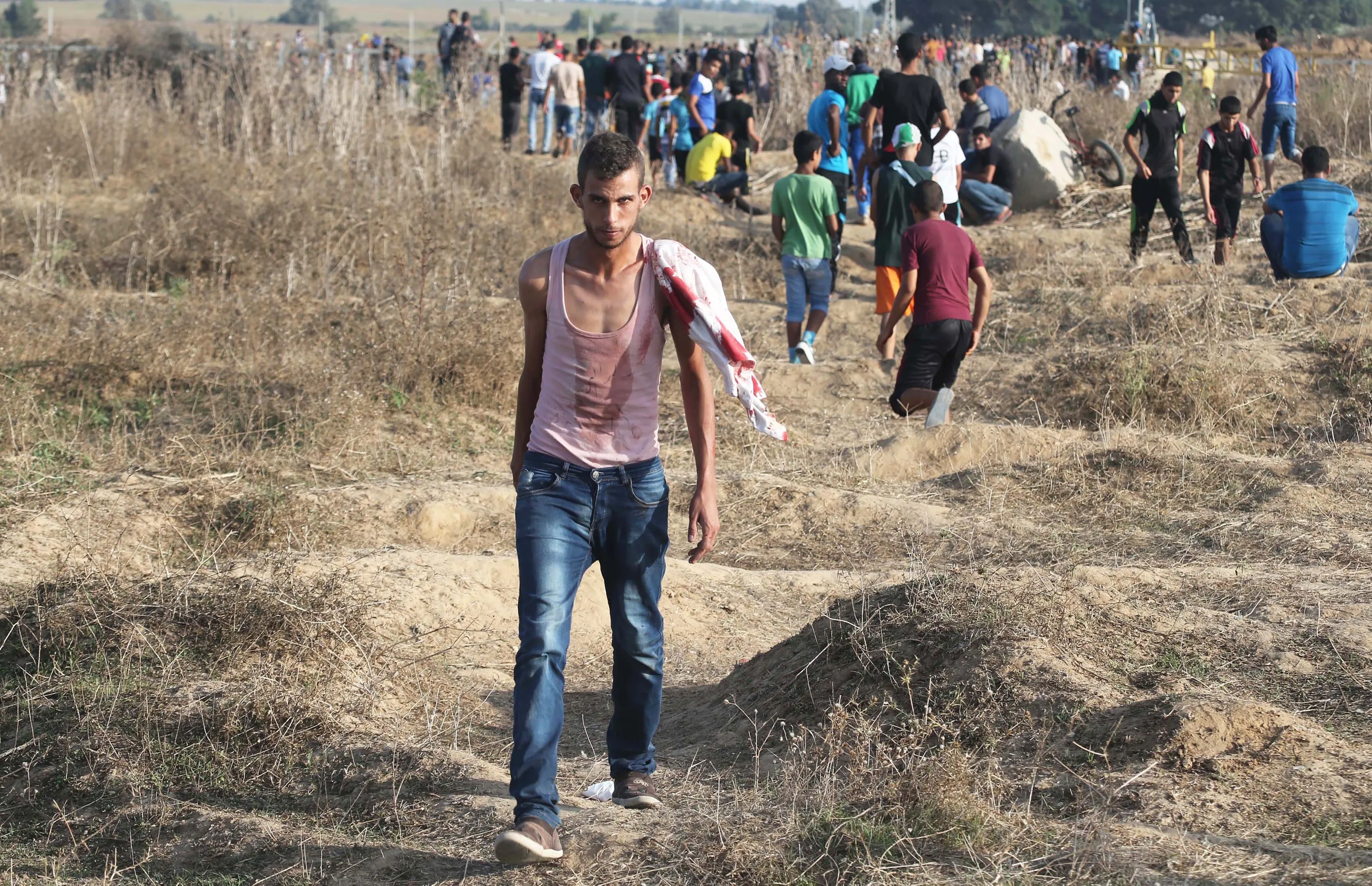 A Palestinian with blood on his clothes leaves the frontline during clashes with Israeli troops near the border between Israel and Central Gaza Strip October 13, 2015. (Photo by Ibraheem Abu Mustafa/Reuters)