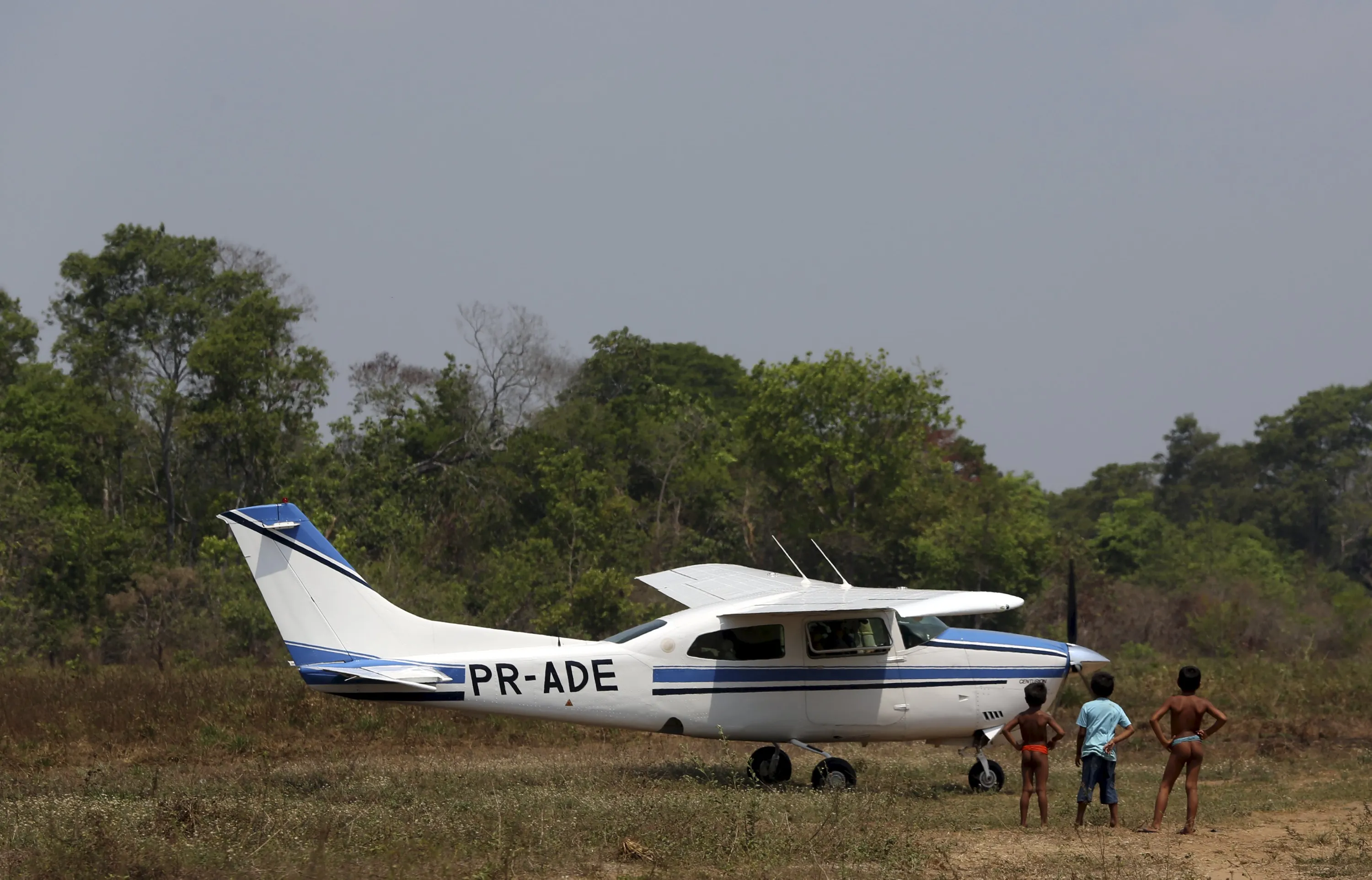 Indigenous people from the Kamayura tribe watch a Cesna aircraft leaving their village at the Xingu national park in Mato Grosso, Brazil, October 3, 2015. (Photo by Paulo Whitaker/Reuters)