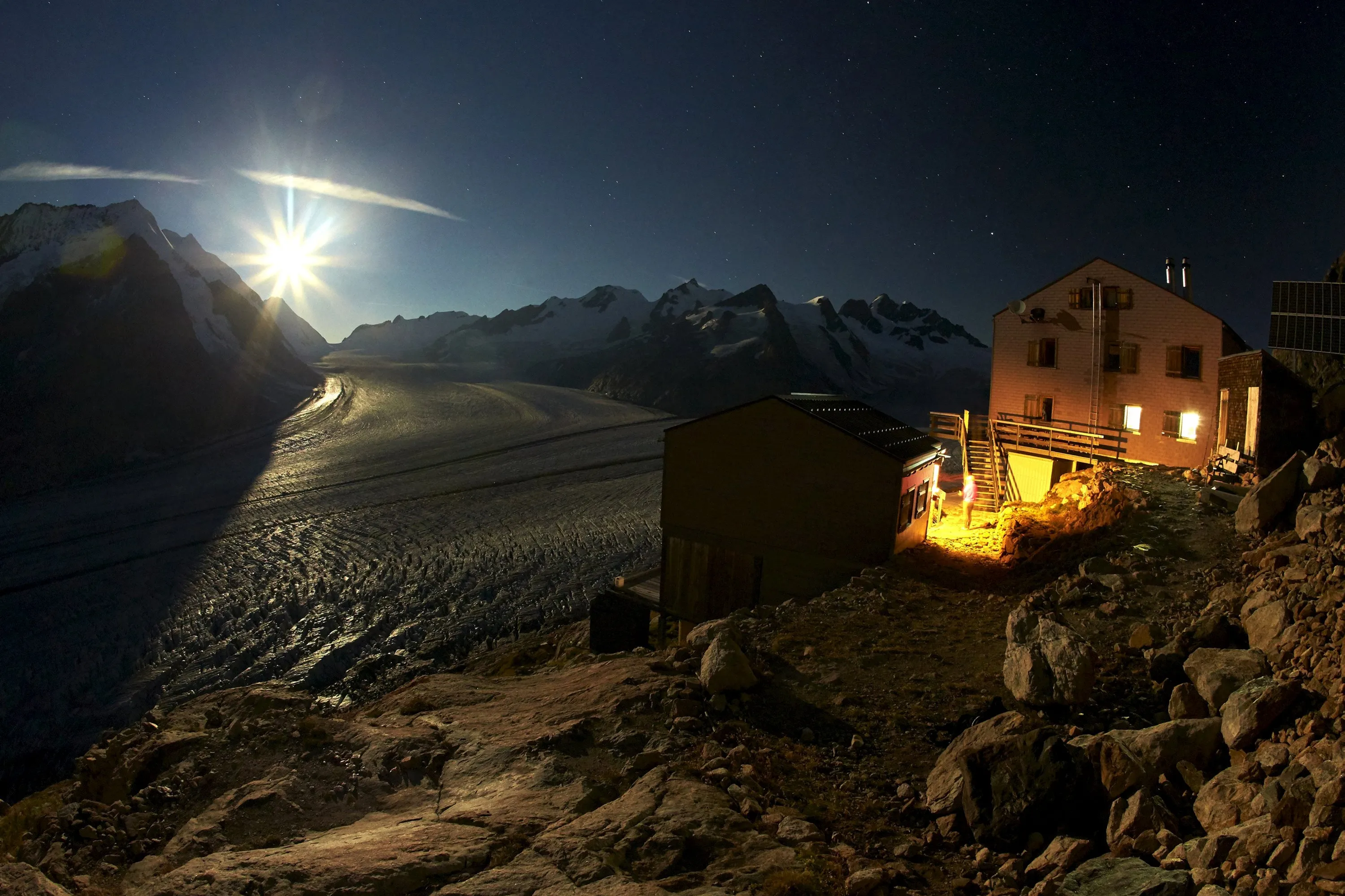 Hikers get ready under the full moon at the Konkordia Hut above the Aletsch Glacier at Konkordia Place, Switzerland, August 29, 2015. (Photo by Denis Balibouse/Reuters)