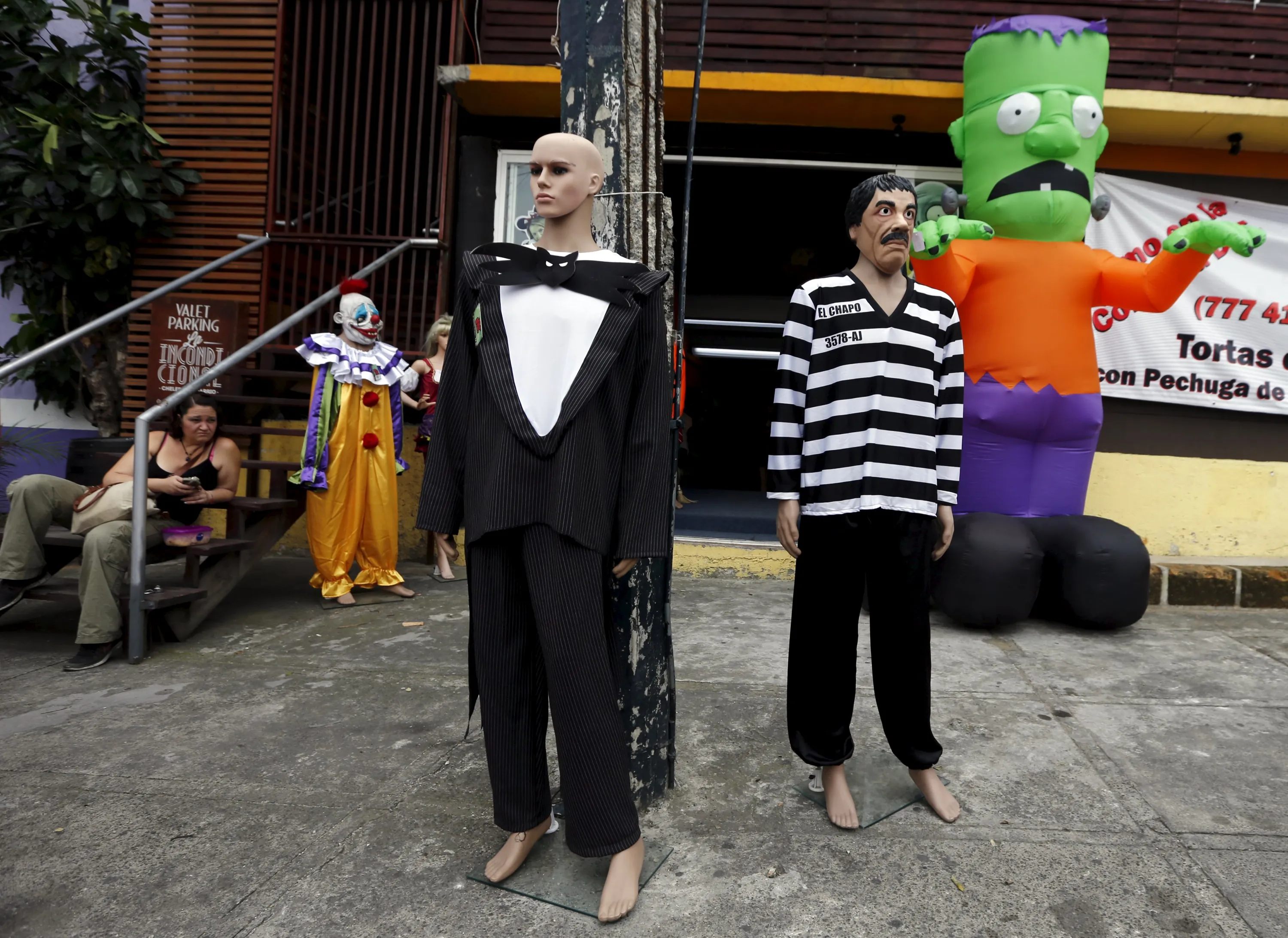 A Guzman costume (2nd R) is pictured on display at the front of a shop in the Mexican city of Cuernavaca near Mexico City October 14, 2015. (Photo by Henry Romero/Reuters)