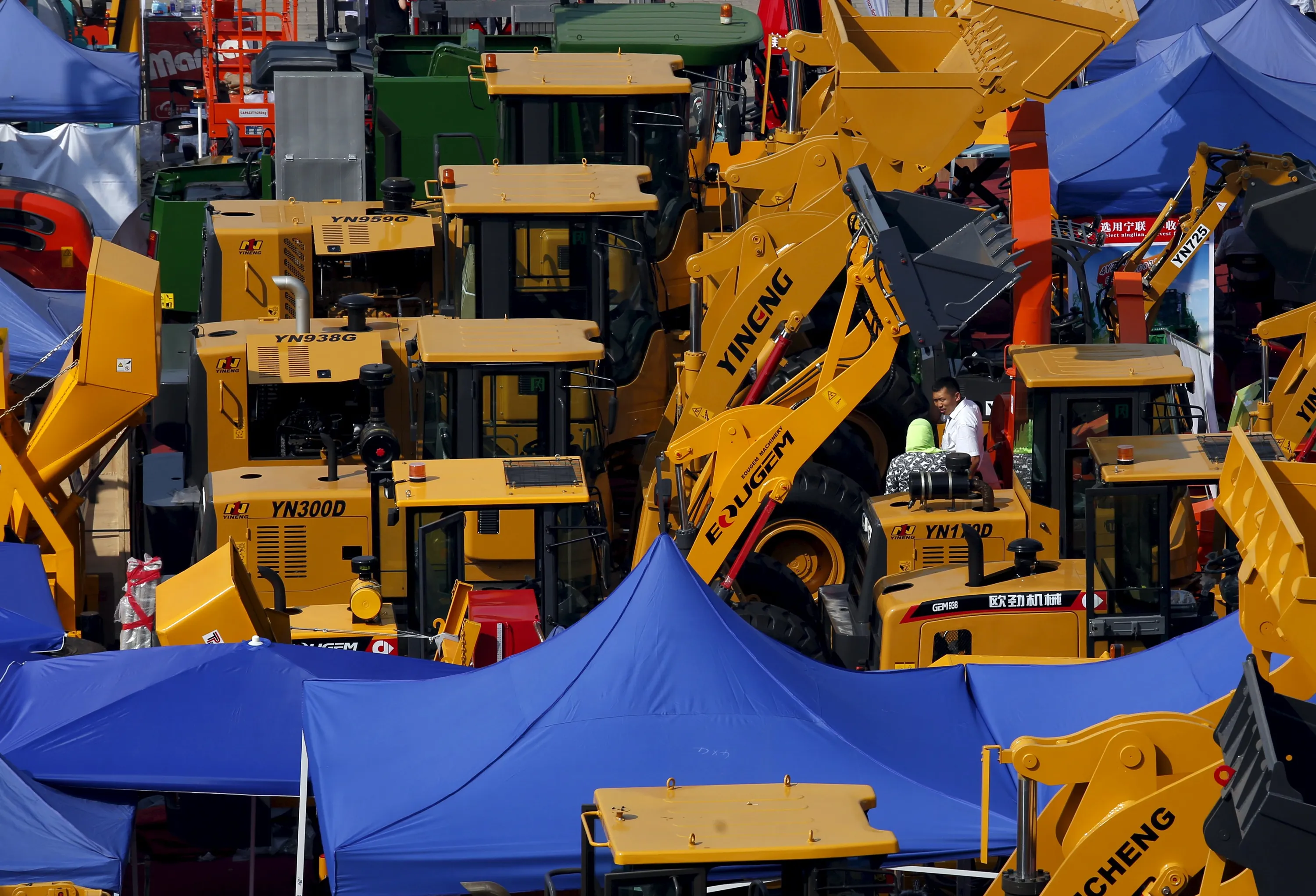 An exhibitor (R) chats with a visitor amidst construction vehicles on display at the China Import and Export Fair, also known as Canton Fair, in the southern Chinese city of Guangzhou October 15, 2015. (Photo by Bobby Yip/Reuters)