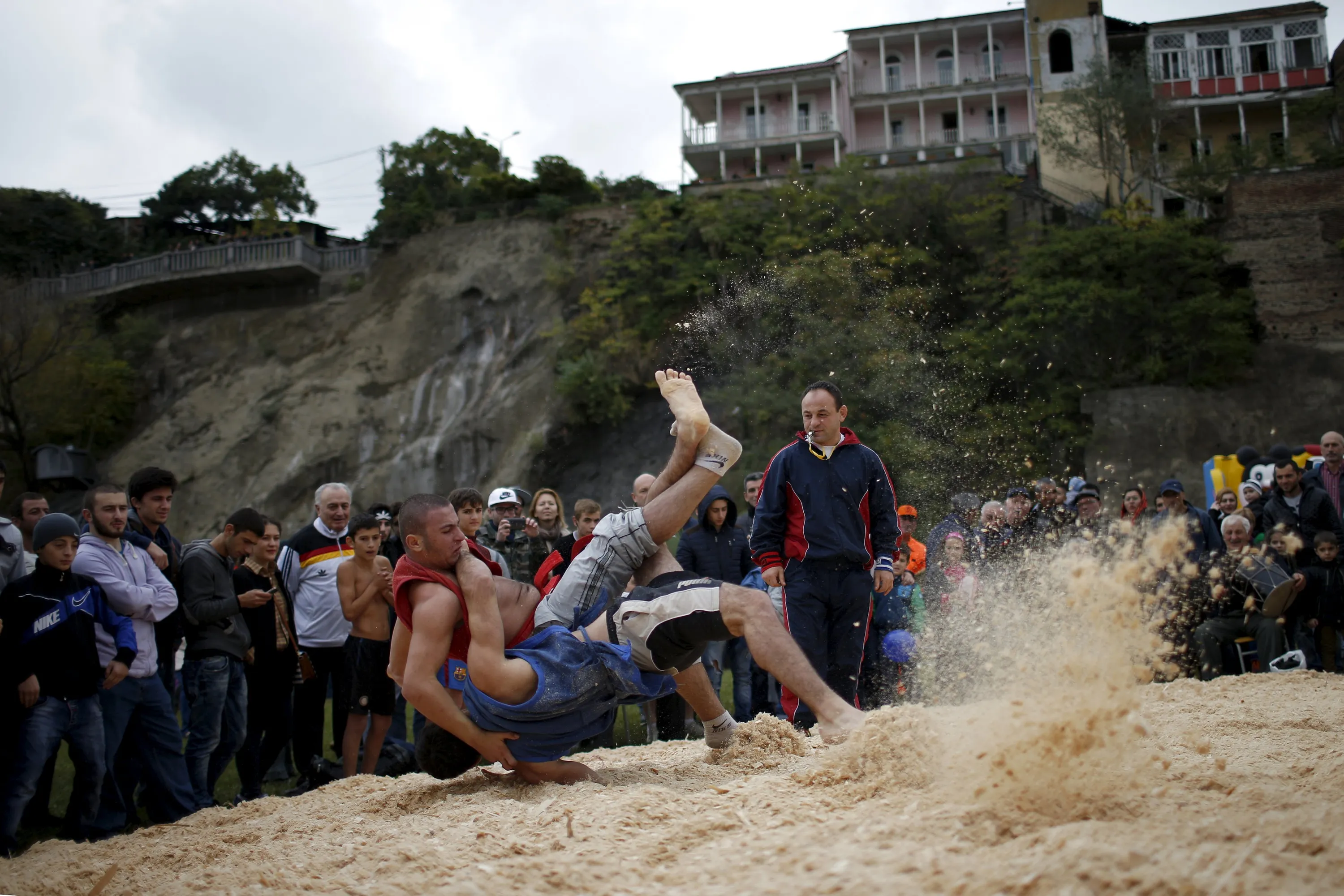 Youths wrestle a traditional Georgian wrestling during the annual Tbilisoba festival, celebrating Tbilisi City Day in Tbilisi, Georgia, October 17, 2015. (Photo by David Mdzinarishvili/Reuters)