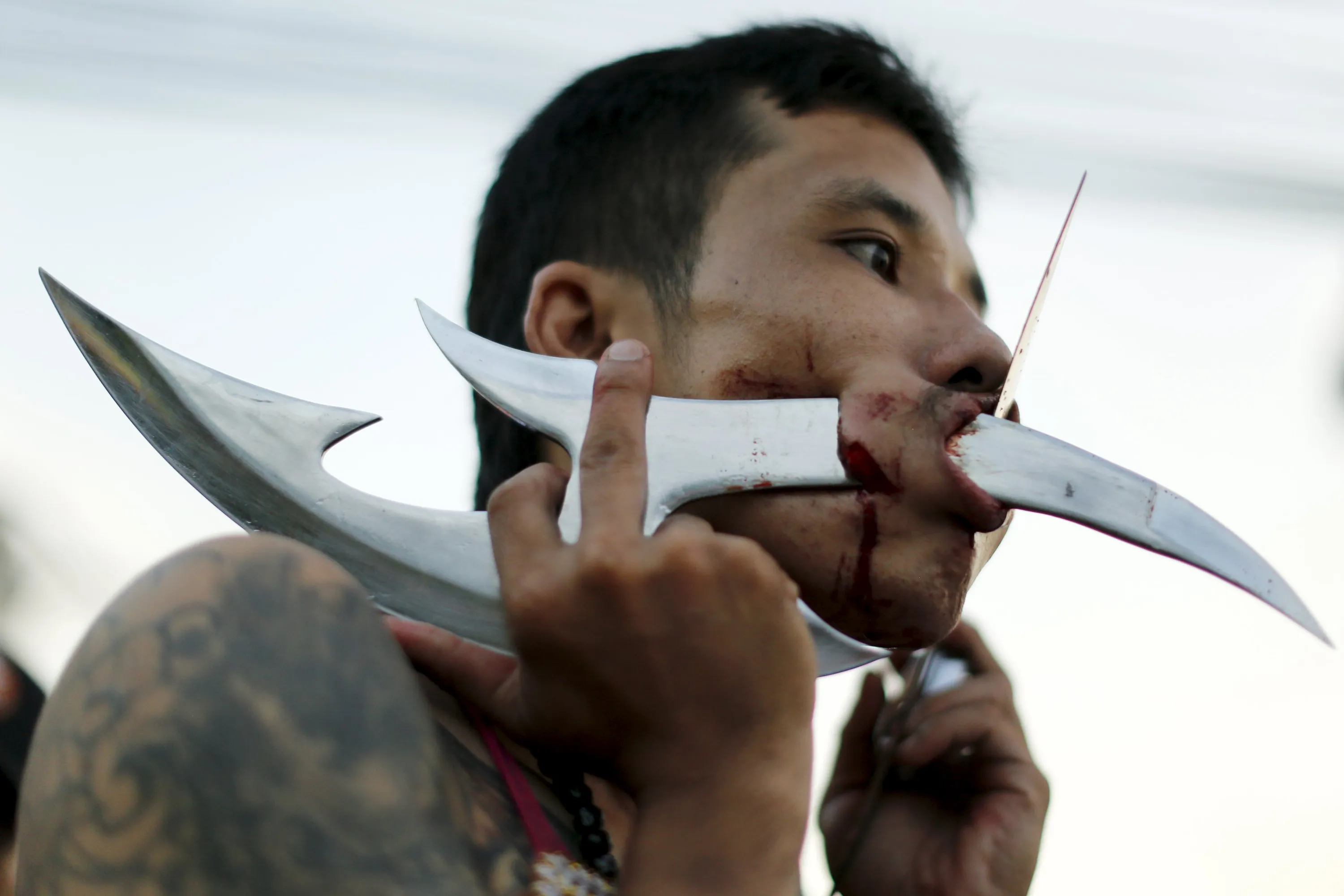 A devotee of the Chinese Ban Tha Rue shrine have knives pierced through his cheeks during a procession celebrating the annual vegetarian festival in Phuket, Thailand, October 17, 2015. (Photo by Jorge Silva/Reuters)